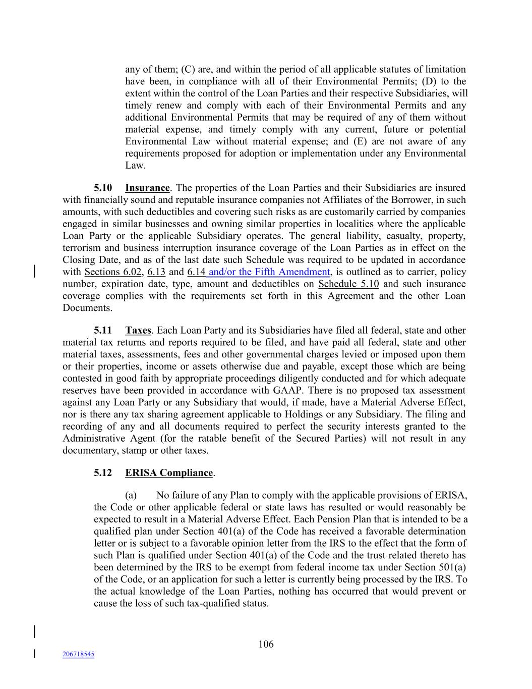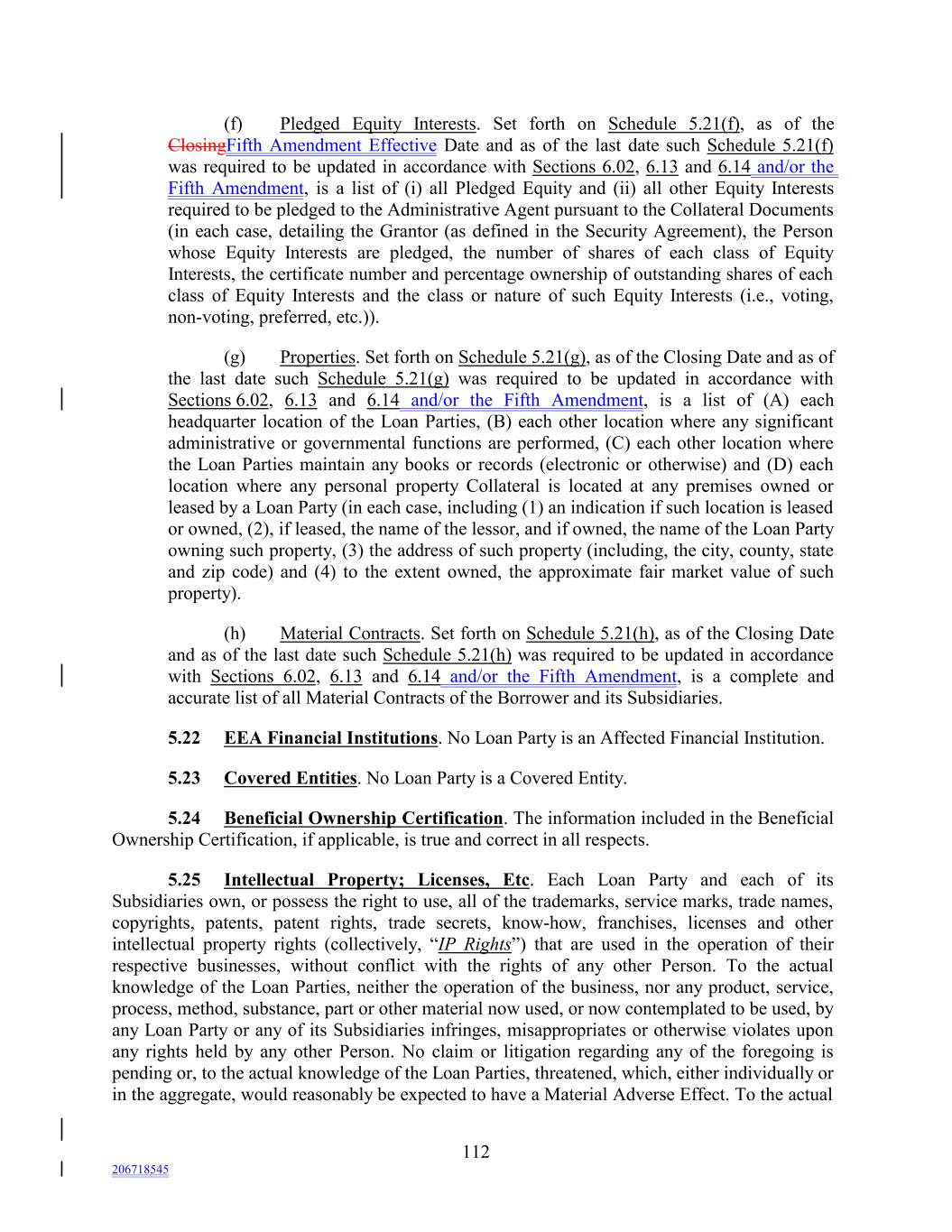 4 206746446 the Fifth Amendment Effective Date) in the amount of $8,220,000, which shall be fully earned, non- refundable and due and payable on the date hereof; (f) the Administrative Agent shall have received all fees and expenses required to be paid or reimbursed by the Borrower hereunder, under the Existing Credit Agreement or any separate letter agreements to which the Borrower is a party (in the case of expenses, to the extent reflected on a summary invoice), including (i) all fees and expenses of McGuireWoods LLP, Caspi & Co. and NautaDutilh New York P.C., as counsel to the Administrative Agent, incurred through the Fifth Amendment Effective Date, in the amount of $926,337.93 and (ii) all fees and expenses of FTI Consulting, Inc., as financial consultant to the Administrative Agent, incurred through the Fifth Amendment Effective Date in the amount of $387,914; (g) the Administrative Agent shall have received a detailed description of the scope of services of the Borrower’s financial consultant, Evercore Inc.; (h) the Administrative Agent shall have received (i) an Officer’s Certificate for each of the Loan Parties (other than the New Borrower), dated as of the Fifth Amendment Effective Date, (A) certifying as to the Organization Documents of each such Loan Party (which, to the extent filed with a Governmental Authority, shall be certified as of a recent date by such Governmental Authority), the resolutions of the governing body of each such Loan Party, the good standing, existence or its equivalent of each such Loan Party and of the incumbency (including specimen signatures) of the Responsible Officers of each such Loan Party and (B) certifying, among other things, as to the accuracy of the representations and warranties set forth in Section 4 hereof; and (ii) (x) searches of UCC filings in the jurisdiction of incorporation or formation, as applicable, of each Loan Party (including the New Borrower) and each jurisdiction where any Collateral is located or where a filing would need to be made in order to perfect the Administrative Agent’s security interest in the Collateral, copies of the financing statements on file in such jurisdictions and evidence that no Liens exist other than Permitted Liens and (y) tax lien and judgment searches; (i) the Administrative Agent shall have received an opinion or opinions of U.S. counsel for the Loan Parties, dated as of the Fifth Amendment Effective Date and addressed to the Administrative Agent and the Lenders, in form and substance acceptable to the Administrative Agent; and (j) Upon the reasonable request of any Lender, the Borrower shall have provided to such Lender, and such Lender shall be reasonably satisfied with, the documentation and other information so requested in connection with applicable “know your customer” and anti-money-laundering rules and regulations, including, without limitation, the Patriot Act, and any Loan Party that qualifies as a “legal entity customer” under the Beneficial Ownership Regulation shall have delivered to each Lender that so requests, a Beneficial Ownership Certification in relation to such Loan Party. SECTION 6. Effect of Amendment. (a) Except as expressly set forth herein, this Amendment shall not by implication or otherwise limit, impair, constitute a waiver of or otherwise affect the rights and remedies of the Lenders or the Administrative Agent under the Credit Agreement or any other Loan Document, and shall not alter, modify, amend or in any way affect any of the terms, conditions, obligations, covenants or agreements contained in the Credit Agreement or any other provision of the Credit Agreement or of any other Loan Document, all of which are ratified and affirmed in all respects and shall continue in full force and effect. Nothing herein shall be deemed to entitle the Borrower to a consent to, or a waiver, amendment, modification or other change of, any of the terms, conditions, obligations, covenants or agreements contained in the Credit Agreement or any other Loan Document in similar or different circumstances. The parties hereto acknowledge and agree that the amendment of the Existing Credit Agreement pursuant to this Amendment