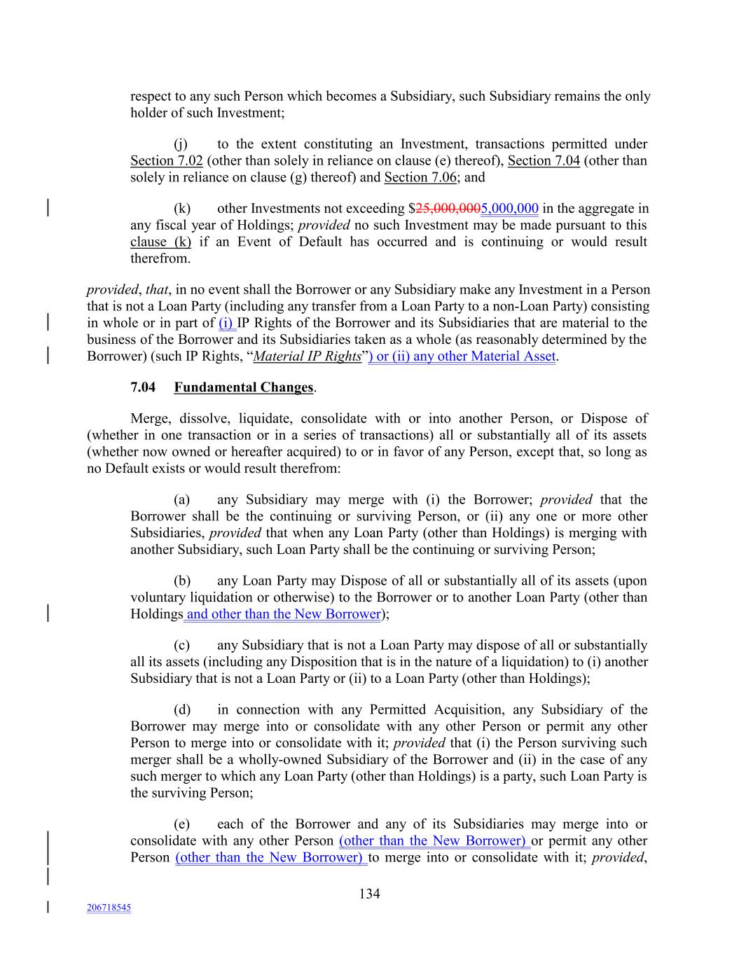 respect to any such Person which becomes a Subsidiary, such Subsidiary remains the only holder of such Investment; (j) to the extent constituting an Investment, transactions permitted under Section 7.02 (other than solely in reliance on clause (e) thereof), Section 7.04 (other than solely in reliance on clause (g) thereof) and Section 7.06; and (k) other Investments not exceeding $25,000,0005,000,000 in the aggregate in any fiscal year of Holdings; provided no such Investment may be made pursuant to this clause (k) if an Event of Default has occurred and is continuing or would result therefrom. provided, that, in no event shall the Borrower or any Subsidiary make any Investment in a Person that is not a Loan Party (including any transfer from a Loan Party to a non-Loan Party) consisting in whole or in part of (i) IP Rights of the Borrower and its Subsidiaries that are material to the business of the Borrower and its Subsidiaries taken as a whole (as reasonably determined by the Borrower) (such IP Rights, “Material IP Rights”) or (ii) any other Material Asset. 7.04 Fundamental Changes. Merge, dissolve, liquidate, consolidate with or into another Person, or Dispose of (whether in one transaction or in a series of transactions) all or substantially all of its assets (whether now owned or hereafter acquired) to or in favor of any Person, except that, so long as no Default exists or would result therefrom: (a) any Subsidiary may merge with (i) the Borrower; provided that the Borrower shall be the continuing or surviving Person, or (ii) any one or more other Subsidiaries, provided that when any Loan Party (other than Holdings) is merging with another Subsidiary, such Loan Party shall be the continuing or surviving Person; (b) any Loan Party may Dispose of all or substantially all of its assets (upon voluntary liquidation or otherwise) to the Borrower or to another Loan Party (other than Holdings and other than the New Borrower); (c) any Subsidiary that is not a Loan Party may dispose of all or substantially all its assets (including any Disposition that is in the nature of a liquidation) to (i) another Subsidiary that is not a Loan Party or (ii) to a Loan Party (other than Holdings); (d) in connection with any Permitted Acquisition, any Subsidiary of the Borrower may merge into or consolidate with any other Person or permit any other Person to merge into or consolidate with it; provided that (i) the Person surviving such merger shall be a wholly-owned Subsidiary of the Borrower and (ii) in the case of any such merger to which any Loan Party (other than Holdings) is a party, such Loan Party is the surviving Person; (e) each of the Borrower and any of its Subsidiaries may merge into or consolidate with any other Person (other than the New Borrower) or permit any other Person (other than the New Borrower) to merge into or consolidate with it; provided, 134 206718545