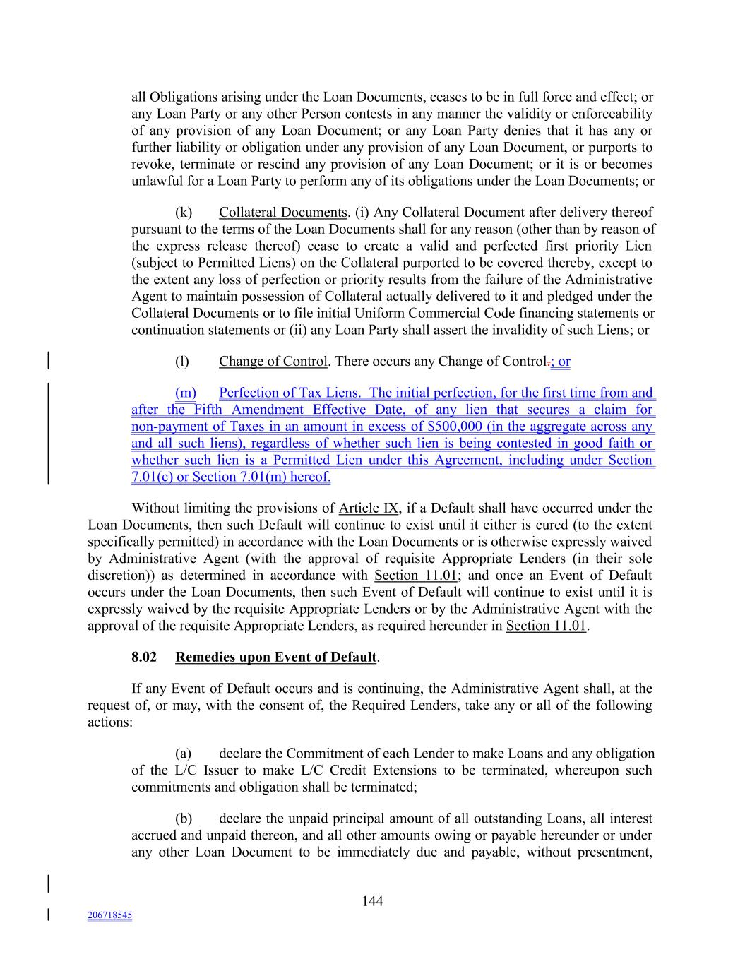 all Obligations arising under the Loan Documents, ceases to be in full force and effect; or any Loan Party or any other Person contests in any manner the validity or enforceability of any provision of any Loan Document; or any Loan Party denies that it has any or further liability or obligation under any provision of any Loan Document, or purports to revoke, terminate or rescind any provision of any Loan Document; or it is or becomes unlawful for a Loan Party to perform any of its obligations under the Loan Documents; or (k) Collateral Documents. (i) Any Collateral Document after delivery thereof pursuant to the terms of the Loan Documents shall for any reason (other than by reason of the express release thereof) cease to create a valid and perfected first priority Lien (subject to Permitted Liens) on the Collateral purported to be covered thereby, except to the extent any loss of perfection or priority results from the failure of the Administrative Agent to maintain possession of Collateral actually delivered to it and pledged under the Collateral Documents or to file initial Uniform Commercial Code financing statements or continuation statements or (ii) any Loan Party shall assert the invalidity of such Liens; or (l) Change of Control. There occurs any Change of Control.; or (m) Perfection of Tax Liens. The initial perfection, for the first time from and after the Fifth Amendment Effective Date, of any lien that secures a claim for non-payment of Taxes in an amount in excess of $500,000 (in the aggregate across any and all such liens), regardless of whether such lien is being contested in good faith or whether such lien is a Permitted Lien under this Agreement, including under Section 7.01(c) or Section 7.01(m) hereof. Without limiting the provisions of Article IX, if a Default shall have occurred under the Loan Documents, then such Default will continue to exist until it either is cured (to the extent specifically permitted) in accordance with the Loan Documents or is otherwise expressly waived by Administrative Agent (with the approval of requisite Appropriate Lenders (in their sole discretion)) as determined in accordance with Section 11.01; and once an Event of Default occurs under the Loan Documents, then such Event of Default will continue to exist until it is expressly waived by the requisite Appropriate Lenders or by the Administrative Agent with the approval of the requisite Appropriate Lenders, as required hereunder in Section 11.01. 8.02 Remedies upon Event of Default. If any Event of Default occurs and is continuing, the Administrative Agent shall, at the request of, or may, with the consent of, the Required Lenders, take any or all of the following actions: (a) declare the Commitment of each Lender to make Loans and any obligation of the L/C Issuer to make L/C Credit Extensions to be terminated, whereupon such commitments and obligation shall be terminated; (b) declare the unpaid principal amount of all outstanding Loans, all interest accrued and unpaid thereon, and all other amounts owing or payable hereunder or under any other Loan Document to be immediately due and payable, without presentment, 144 206718545