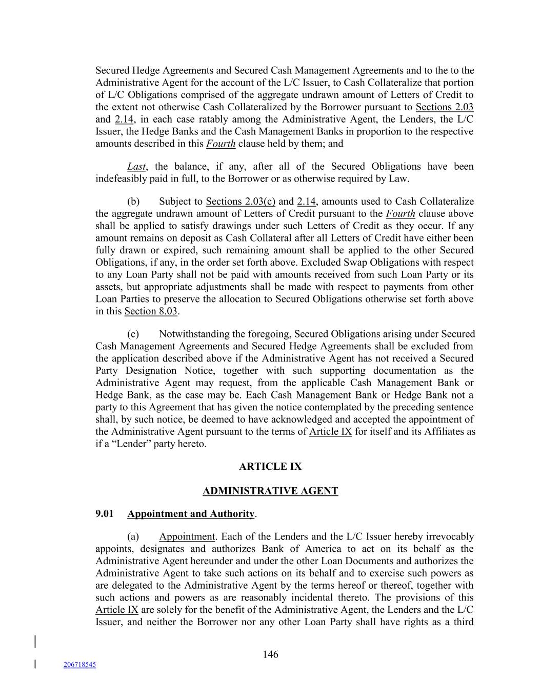Secured Hedge Agreements and Secured Cash Management Agreements and to the to the Administrative Agent for the account of the L/C Issuer, to Cash Collateralize that portion of L/C Obligations comprised of the aggregate undrawn amount of Letters of Credit to the extent not otherwise Cash Collateralized by the Borrower pursuant to Sections 2.03 and 2.14, in each case ratably among the Administrative Agent, the Lenders, the L/C Issuer, the Hedge Banks and the Cash Management Banks in proportion to the respective amounts described in this Fourth clause held by them; and Last, the balance, if any, after all of the Secured Obligations have been indefeasibly paid in full, to the Borrower or as otherwise required by Law. (b) Subject to Sections 2.03(c) and 2.14, amounts used to Cash Collateralize the aggregate undrawn amount of Letters of Credit pursuant to the Fourth clause above shall be applied to satisfy drawings under such Letters of Credit as they occur. If any amount remains on deposit as Cash Collateral after all Letters of Credit have either been fully drawn or expired, such remaining amount shall be applied to the other Secured Obligations, if any, in the order set forth above. Excluded Swap Obligations with respect to any Loan Party shall not be paid with amounts received from such Loan Party or its assets, but appropriate adjustments shall be made with respect to payments from other Loan Parties to preserve the allocation to Secured Obligations otherwise set forth above in this Section 8.03. (c) Notwithstanding the foregoing, Secured Obligations arising under Secured Cash Management Agreements and Secured Hedge Agreements shall be excluded from the application described above if the Administrative Agent has not received a Secured Party Designation Notice, together with such supporting documentation as the Administrative Agent may request, from the applicable Cash Management Bank or Hedge Bank, as the case may be. Each Cash Management Bank or Hedge Bank not a party to this Agreement that has given the notice contemplated by the preceding sentence shall, by such notice, be deemed to have acknowledged and accepted the appointment of the Administrative Agent pursuant to the terms of Article IX for itself and its Affiliates as if a “Lender” party hereto. ARTICLE IX ADMINISTRATIVE AGENT 9.01 Appointment and Authority. (a) Appointment. Each of the Lenders and the L/C Issuer hereby irrevocably appoints, designates and authorizes Bank of America to act on its behalf as the Administrative Agent hereunder and under the other Loan Documents and authorizes the Administrative Agent to take such actions on its behalf and to exercise such powers as are delegated to the Administrative Agent by the terms hereof or thereof, together with such actions and powers as are reasonably incidental thereto. The provisions of this Article IX are solely for the benefit of the Administrative Agent, the Lenders and the L/C Issuer, and neither the Borrower nor any other Loan Party shall have rights as a third 146 206718545