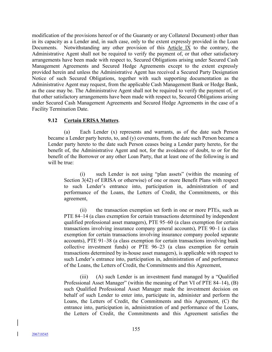 modification of the provisions hereof or of the Guaranty or any Collateral Document) other than in its capacity as a Lender and, in such case, only to the extent expressly provided in the Loan Documents. Notwithstanding any other provision of this Article IX to the contrary, the Administrative Agent shall not be required to verify the payment of, or that other satisfactory arrangements have been made with respect to, Secured Obligations arising under Secured Cash Management Agreements and Secured Hedge Agreements except to the extent expressly provided herein and unless the Administrative Agent has received a Secured Party Designation Notice of such Secured Obligations, together with such supporting documentation as the Administrative Agent may request, from the applicable Cash Management Bank or Hedge Bank, as the case may be. The Administrative Agent shall not be required to verify the payment of, or that other satisfactory arrangements have been made with respect to, Secured Obligations arising under Secured Cash Management Agreements and Secured Hedge Agreements in the case of a Facility Termination Date. 9.12 Certain ERISA Matters. (a) Each Lender (x) represents and warrants, as of the date such Person became a Lender party hereto, to, and (y) covenants, from the date such Person became a Lender party hereto to the date such Person ceases being a Lender party hereto, for the benefit of, the Administrative Agent and not, for the avoidance of doubt, to or for the benefit of the Borrower or any other Loan Party, that at least one of the following is and will be true: (i) such Lender is not using “plan assets” (within the meaning of Section 3(42) of ERISA or otherwise) of one or more Benefit Plans with respect to such Lender’s entrance into, participation in, administration of and performance of the Loans, the Letters of Credit, the Commitments, or this agreement, (ii) the transaction exemption set forth in one or more PTEs, such as PTE 84–14 (a class exemption for certain transactions determined by independent qualified professional asset managers), PTE 95–60 (a class exemption for certain transactions involving insurance company general accounts), PTE 90–1 (a class exemption for certain transactions involving insurance company pooled separate accounts), PTE 91–38 (a class exemption for certain transactions involving bank collective investment funds) or PTE 96–23 (a class exemption for certain transactions determined by in-house asset managers), is applicable with respect to such Lender’s entrance into, participation in, administration of and performance of the Loans, the Letters of Credit, the Commitments and this Agreement, (iii) (A) such Lender is an investment fund managed by a “Qualified Professional Asset Manager” (within the meaning of Part VI of PTE 84–14), (B) such Qualified Professional Asset Manager made the investment decision on behalf of such Lender to enter into, participate in, administer and perform the Loans, the Letters of Credit, the Commitments and this Agreement, (C) the entrance into, participation in, administration of and performance of the Loans, the Letters of Credit, the Commitments and this Agreement satisfies the 155 206718545