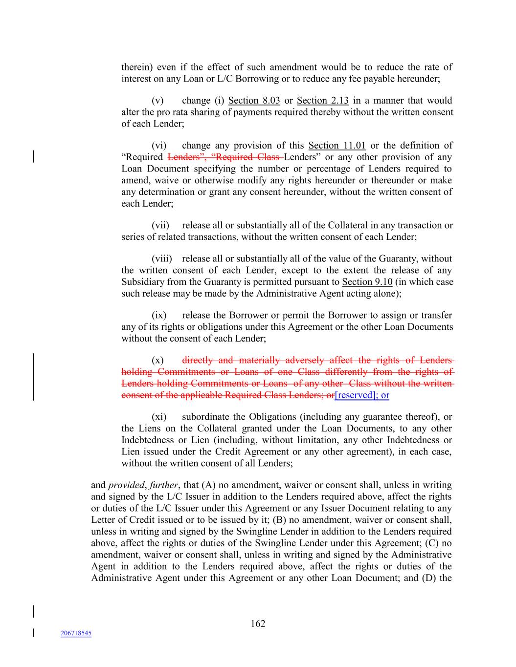 therein) even if the effect of such amendment would be to reduce the rate of interest on any Loan or L/C Borrowing or to reduce any fee payable hereunder; (v) change (i) Section 8.03 or Section 2.13 in a manner that would alter the pro rata sharing of payments required thereby without the written consent of each Lender; (vi) change any provision of this Section 11.01 or the definition of “Required Lenders”, “Required Class Lenders” or any other provision of any Loan Document specifying the number or percentage of Lenders required to amend, waive or otherwise modify any rights hereunder or thereunder or make any determination or grant any consent hereunder, without the written consent of each Lender; (vii) release all or substantially all of the Collateral in any transaction or series of related transactions, without the written consent of each Lender; (viii) release all or substantially all of the value of the Guaranty, without the written consent of each Lender, except to the extent the release of any Subsidiary from the Guaranty is permitted pursuant to Section 9.10 (in which case such release may be made by the Administrative Agent acting alone); (ix) release the Borrower or permit the Borrower to assign or transfer any of its rights or obligations under this Agreement or the other Loan Documents without the consent of each Lender; (x) directly and materially adversely affect the rights of Lenders holding Commitments or Loans of one Class differently from the rights of Lenders holding Commitments or Loans of any other Class without the written consent of the applicable Required Class Lenders; or[reserved]; or (xi) subordinate the Obligations (including any guarantee thereof), or the Liens on the Collateral granted under the Loan Documents, to any other Indebtedness or Lien (including, without limitation, any other Indebtedness or Lien issued under the Credit Agreement or any other agreement), in each case, without the written consent of all Lenders; and provided, further, that (A) no amendment, waiver or consent shall, unless in writing and signed by the L/C Issuer in addition to the Lenders required above, affect the rights or duties of the L/C Issuer under this Agreement or any Issuer Document relating to any Letter of Credit issued or to be issued by it; (B) no amendment, waiver or consent shall, unless in writing and signed by the Swingline Lender in addition to the Lenders required above, affect the rights or duties of the Swingline Lender under this Agreement; (C) no amendment, waiver or consent shall, unless in writing and signed by the Administrative Agent in addition to the Lenders required above, affect the rights or duties of the Administrative Agent under this Agreement or any other Loan Document; and (D) the 162 206718545