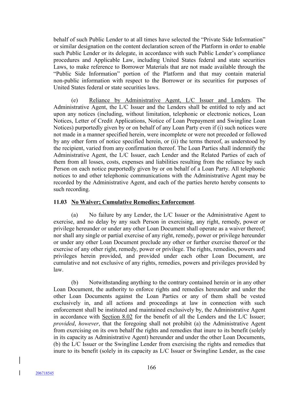 behalf of such Public Lender to at all times have selected the “Private Side Information” or similar designation on the content declaration screen of the Platform in order to enable such Public Lender or its delegate, in accordance with such Public Lender’s compliance procedures and Applicable Law, including United States federal and state securities Laws, to make reference to Borrower Materials that are not made available through the “Public Side Information” portion of the Platform and that may contain material non-public information with respect to the Borrower or its securities for purposes of United States federal or state securities laws. (e) Reliance by Administrative Agent, L/C Issuer and Lenders. The Administrative Agent, the L/C Issuer and the Lenders shall be entitled to rely and act upon any notices (including, without limitation, telephonic or electronic notices, Loan Notices, Letter of Credit Applications, Notice of Loan Prepayment and Swingline Loan Notices) purportedly given by or on behalf of any Loan Party even if (i) such notices were not made in a manner specified herein, were incomplete or were not preceded or followed by any other form of notice specified herein, or (ii) the terms thereof, as understood by the recipient, varied from any confirmation thereof. The Loan Parties shall indemnify the Administrative Agent, the L/C Issuer, each Lender and the Related Parties of each of them from all losses, costs, expenses and liabilities resulting from the reliance by such Person on each notice purportedly given by or on behalf of a Loan Party. All telephonic notices to and other telephonic communications with the Administrative Agent may be recorded by the Administrative Agent, and each of the parties hereto hereby consents to such recording. 11.03 No Waiver; Cumulative Remedies; Enforcement. (a) No failure by any Lender, the L/C Issuer or the Administrative Agent to exercise, and no delay by any such Person in exercising, any right, remedy, power or privilege hereunder or under any other Loan Document shall operate as a waiver thereof; nor shall any single or partial exercise of any right, remedy, power or privilege hereunder or under any other Loan Document preclude any other or further exercise thereof or the exercise of any other right, remedy, power or privilege. The rights, remedies, powers and privileges herein provided, and provided under each other Loan Document, are cumulative and not exclusive of any rights, remedies, powers and privileges provided by law. (b) Notwithstanding anything to the contrary contained herein or in any other Loan Document, the authority to enforce rights and remedies hereunder and under the other Loan Documents against the Loan Parties or any of them shall be vested exclusively in, and all actions and proceedings at law in connection with such enforcement shall be instituted and maintained exclusively by, the Administrative Agent in accordance with Section 8.02 for the benefit of all the Lenders and the L/C Issuer; provided, however, that the foregoing shall not prohibit (a) the Administrative Agent from exercising on its own behalf the rights and remedies that inure to its benefit (solely in its capacity as Administrative Agent) hereunder and under the other Loan Documents, (b) the L/C Issuer or the Swingline Lender from exercising the rights and remedies that inure to its benefit (solely in its capacity as L/C Issuer or Swingline Lender, as the case 166 206718545