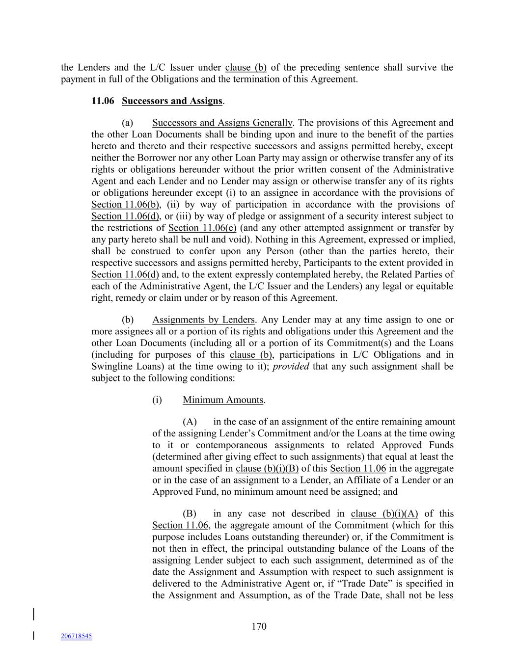 the Lenders and the L/C Issuer under clause (b) of the preceding sentence shall survive the payment in full of the Obligations and the termination of this Agreement. 11.06 Successors and Assigns. (a) Successors and Assigns Generally. The provisions of this Agreement and the other Loan Documents shall be binding upon and inure to the benefit of the parties hereto and thereto and their respective successors and assigns permitted hereby, except neither the Borrower nor any other Loan Party may assign or otherwise transfer any of its rights or obligations hereunder without the prior written consent of the Administrative Agent and each Lender and no Lender may assign or otherwise transfer any of its rights or obligations hereunder except (i) to an assignee in accordance with the provisions of Section 11.06(b), (ii) by way of participation in accordance with the provisions of Section 11.06(d), or (iii) by way of pledge or assignment of a security interest subject to the restrictions of Section 11.06(e) (and any other attempted assignment or transfer by any party hereto shall be null and void). Nothing in this Agreement, expressed or implied, shall be construed to confer upon any Person (other than the parties hereto, their respective successors and assigns permitted hereby, Participants to the extent provided in Section 11.06(d) and, to the extent expressly contemplated hereby, the Related Parties of each of the Administrative Agent, the L/C Issuer and the Lenders) any legal or equitable right, remedy or claim under or by reason of this Agreement. (b) Assignments by Lenders. Any Lender may at any time assign to one or more assignees all or a portion of its rights and obligations under this Agreement and the other Loan Documents (including all or a portion of its Commitment(s) and the Loans (including for purposes of this clause (b), participations in L/C Obligations and in Swingline Loans) at the time owing to it); provided that any such assignment shall be subject to the following conditions: (i) Minimum Amounts. (A) in the case of an assignment of the entire remaining amount of the assigning Lender’s Commitment and/or the Loans at the time owing to it or contemporaneous assignments to related Approved Funds (determined after giving effect to such assignments) that equal at least the amount specified in clause (b)(i)(B) of this Section 11.06 in the aggregate or in the case of an assignment to a Lender, an Affiliate of a Lender or an Approved Fund, no minimum amount need be assigned; and (B) in any case not described in clause (b)(i)(A) of this Section 11.06, the aggregate amount of the Commitment (which for this purpose includes Loans outstanding thereunder) or, if the Commitment is not then in effect, the principal outstanding balance of the Loans of the assigning Lender subject to each such assignment, determined as of the date the Assignment and Assumption with respect to such assignment is delivered to the Administrative Agent or, if “Trade Date” is specified in the Assignment and Assumption, as of the Trade Date, shall not be less 170 206718545