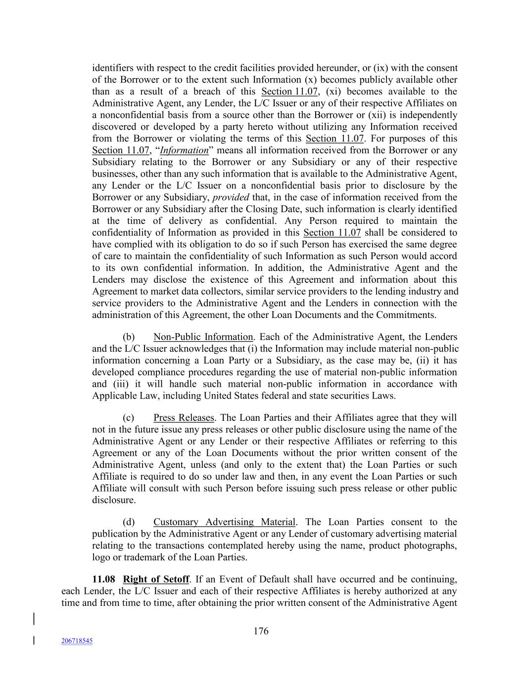 identifiers with respect to the credit facilities provided hereunder, or (ix) with the consent of the Borrower or to the extent such Information (x) becomes publicly available other than as a result of a breach of this Section 11.07, (xi) becomes available to the Administrative Agent, any Lender, the L/C Issuer or any of their respective Affiliates on a nonconfidential basis from a source other than the Borrower or (xii) is independently discovered or developed by a party hereto without utilizing any Information received from the Borrower or violating the terms of this Section 11.07. For purposes of this Section 11.07, “Information” means all information received from the Borrower or any Subsidiary relating to the Borrower or any Subsidiary or any of their respective businesses, other than any such information that is available to the Administrative Agent, any Lender or the L/C Issuer on a nonconfidential basis prior to disclosure by the Borrower or any Subsidiary, provided that, in the case of information received from the Borrower or any Subsidiary after the Closing Date, such information is clearly identified at the time of delivery as confidential. Any Person required to maintain the confidentiality of Information as provided in this Section 11.07 shall be considered to have complied with its obligation to do so if such Person has exercised the same degree of care to maintain the confidentiality of such Information as such Person would accord to its own confidential information. In addition, the Administrative Agent and the Lenders may disclose the existence of this Agreement and information about this Agreement to market data collectors, similar service providers to the lending industry and service providers to the Administrative Agent and the Lenders in connection with the administration of this Agreement, the other Loan Documents and the Commitments. (b) Non-Public Information. Each of the Administrative Agent, the Lenders and the L/C Issuer acknowledges that (i) the Information may include material non-public information concerning a Loan Party or a Subsidiary, as the case may be, (ii) it has developed compliance procedures regarding the use of material non-public information and (iii) it will handle such material non-public information in accordance with Applicable Law, including United States federal and state securities Laws. (c) Press Releases. The Loan Parties and their Affiliates agree that they will not in the future issue any press releases or other public disclosure using the name of the Administrative Agent or any Lender or their respective Affiliates or referring to this Agreement or any of the Loan Documents without the prior written consent of the Administrative Agent, unless (and only to the extent that) the Loan Parties or such Affiliate is required to do so under law and then, in any event the Loan Parties or such Affiliate will consult with such Person before issuing such press release or other public disclosure. (d) Customary Advertising Material. The Loan Parties consent to the publication by the Administrative Agent or any Lender of customary advertising material relating to the transactions contemplated hereby using the name, product photographs, logo or trademark of the Loan Parties. 11.08 Right of Setoff. If an Event of Default shall have occurred and be continuing, each Lender, the L/C Issuer and each of their respective Affiliates is hereby authorized at any time and from time to time, after obtaining the prior written consent of the Administrative Agent 176 206718545