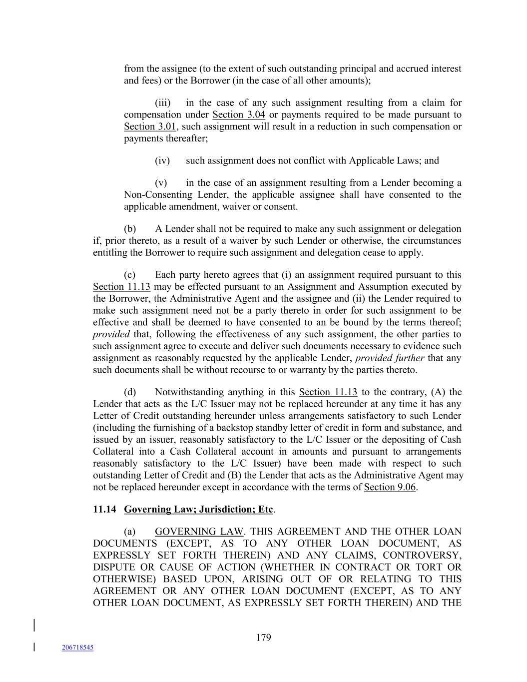 from the assignee (to the extent of such outstanding principal and accrued interest and fees) or the Borrower (in the case of all other amounts); (iii) in the case of any such assignment resulting from a claim for compensation under Section 3.04 or payments required to be made pursuant to Section 3.01, such assignment will result in a reduction in such compensation or payments thereafter; (iv) such assignment does not conflict with Applicable Laws; and (v) in the case of an assignment resulting from a Lender becoming a Non-Consenting Lender, the applicable assignee shall have consented to the applicable amendment, waiver or consent. (b) A Lender shall not be required to make any such assignment or delegation if, prior thereto, as a result of a waiver by such Lender or otherwise, the circumstances entitling the Borrower to require such assignment and delegation cease to apply. (c) Each party hereto agrees that (i) an assignment required pursuant to this Section 11.13 may be effected pursuant to an Assignment and Assumption executed by the Borrower, the Administrative Agent and the assignee and (ii) the Lender required to make such assignment need not be a party thereto in order for such assignment to be effective and shall be deemed to have consented to an be bound by the terms thereof; provided that, following the effectiveness of any such assignment, the other parties to such assignment agree to execute and deliver such documents necessary to evidence such assignment as reasonably requested by the applicable Lender, provided further that any such documents shall be without recourse to or warranty by the parties thereto. (d) Notwithstanding anything in this Section 11.13 to the contrary, (A) the Lender that acts as the L/C Issuer may not be replaced hereunder at any time it has any Letter of Credit outstanding hereunder unless arrangements satisfactory to such Lender (including the furnishing of a backstop standby letter of credit in form and substance, and issued by an issuer, reasonably satisfactory to the L/C Issuer or the depositing of Cash Collateral into a Cash Collateral account in amounts and pursuant to arrangements reasonably satisfactory to the L/C Issuer) have been made with respect to such outstanding Letter of Credit and (B) the Lender that acts as the Administrative Agent may not be replaced hereunder except in accordance with the terms of Section 9.06. 11.14 Governing Law; Jurisdiction; Etc. (a) GOVERNING LAW. THIS AGREEMENT AND THE OTHER LOAN DOCUMENTS (EXCEPT, AS TO ANY OTHER LOAN DOCUMENT, AS EXPRESSLY SET FORTH THEREIN) AND ANY CLAIMS, CONTROVERSY, DISPUTE OR CAUSE OF ACTION (WHETHER IN CONTRACT OR TORT OR OTHERWISE) BASED UPON, ARISING OUT OF OR RELATING TO THIS AGREEMENT OR ANY OTHER LOAN DOCUMENT (EXCEPT, AS TO ANY OTHER LOAN DOCUMENT, AS EXPRESSLY SET FORTH THEREIN) AND THE 179 206718545