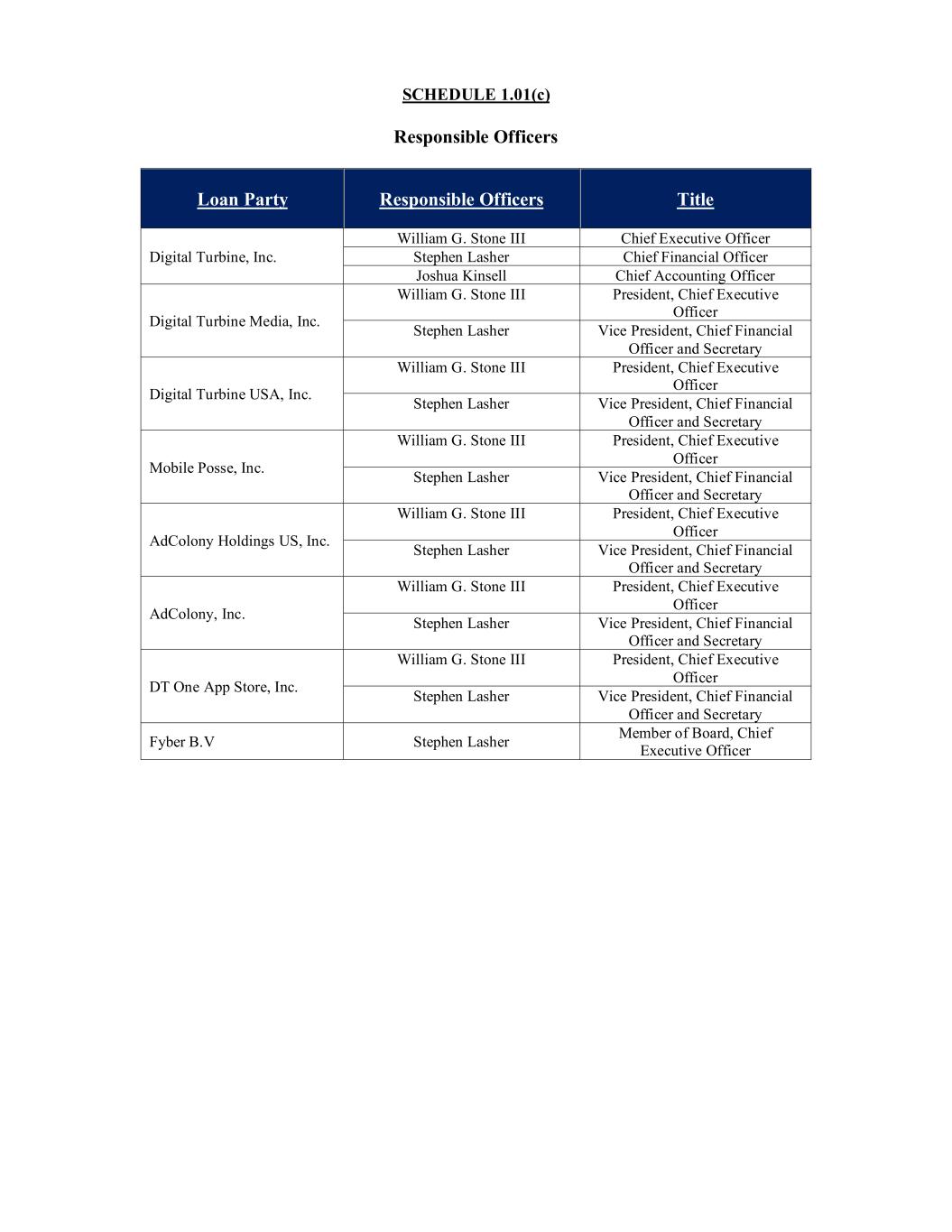 SCHEDULE 1.01(c) Responsible Officers Loan Party Responsible Officers Title Digital Turbine, Inc. William G. Stone III Chief Executive Officer Stephen Lasher Chief Financial Officer Joshua Kinsell Chief Accounting Officer Digital Turbine Media, Inc. William G. Stone III President, Chief Executive Officer Stephen Lasher Vice President, Chief Financial Officer and Secretary Digital Turbine USA, Inc. William G. Stone III President, Chief Executive Officer Stephen Lasher Vice President, Chief Financial Officer and Secretary Mobile Posse, Inc. William G. Stone III President, Chief Executive Officer Stephen Lasher Vice President, Chief Financial Officer and Secretary AdColony Holdings US, Inc. William G. Stone III President, Chief Executive Officer Stephen Lasher Vice President, Chief Financial Officer and Secretary AdColony, Inc. William G. Stone III President, Chief Executive Officer Stephen Lasher Vice President, Chief Financial Officer and Secretary DT One App Store, Inc. William G. Stone III President, Chief Executive Officer Stephen Lasher Vice President, Chief Financial Officer and Secretary Fyber B.V Stephen Lasher Member of Board, Chief Executive Officer