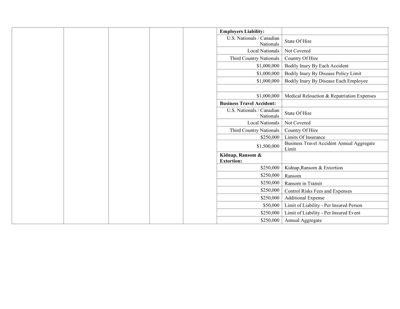 Employers Liability: U.S. Nationals / Canadian Nationals State Of Hire Local Nationals Not Covered Third Country Nationals Country Of Hire $1,000,000 Bodily Inury By Each Accident $1,000,000 Bodily Inury By Disease Policy Limit $1,000,000 Bodily Inury By Disease Each Employee $1,000,000 Medical Reloaction & Repatriation Expenses Business Travel Accident: U.S. Nationals / Canadian Nationals State Of Hire Local Nationals Not Covered Third Country Nationals Country Of Hire $250,000 Limits Of Insurance $1,500,000 Business Travel Accident Annual Aggregate Limit Kidnap, Ransom & Extortion: $250,000 Kidnap,Ransom & Extortion $250,000 Ransom $250,000 Ransom in Transit $250,000 Control Risks Fees and Expenses $250,000 Additional Expense $50,000 Limit of Liability - Per Insured Person $250,000 Limit of Liability - Per Insured Event $250,000 Annual Aggregate