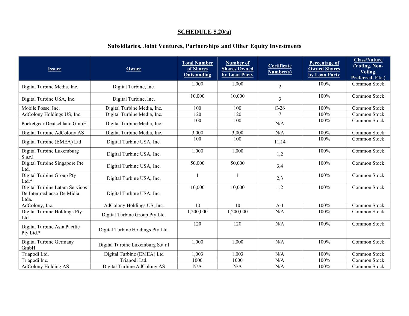 SCHEDULE 5.20(a) Subsidiaries, Joint Ventures, Partnerships and Other Equity Investments Issuer Owner Total Number of Shares Outstanding Number of Shares Owned by Loan Party Certificate Number(s) Percentage of Owned Shares by Loan Party Class/Nature (Voting, Non- Voting, Preferred, Etc.) Digital Turbine Media, Inc. Digital Turbine, Inc. 1,000 1,000 2 100% Common Stock Digital Turbine USA, Inc. Digital Turbine, Inc. 10,000 10,000 3 100% Common Stock Mobile Posse, Inc. Digital Turbine Media, Inc. 100 100 C-26 100% Common Stock AdColony Holdings US, Inc. Digital Turbine Media, Inc. 120 120 7 100% Common Stock Pocketgear Deutschland GmbH Digital Turbine Media, Inc. 100 100 N/A 100% Common Stock Digital Turbine AdColony AS Digital Turbine Media, Inc. 3,000 3,000 N/A 100% Common Stock Digital Turbine (EMEA) Ltd Digital Turbine USA, Inc. 100 100 11,14 100% Common Stock Digital Turbine Luxemburg S.a.r.l Digital Turbine USA, Inc. 1,000 1,000 1,2 100% Common Stock Digital Turbine Singapore Pte Ltd. Digital Turbine USA, Inc. 50,000 50,000 3,4 100% Common Stock Digital Turbine Group Pty Ltd.* Digital Turbine USA, Inc. 1 1 2,3 100% Common Stock Digital Turbine Latam Servicos De Intermediacao De Midia Ltda. Digital Turbine USA, Inc. 10,000 10,000 1,2 100% Common Stock AdColony, Inc. AdColony Holdings US, Inc. 10 10 A-1 100% Common Stock Digital Turbine Holdings Pty Ltd. Digital Turbine Group Pty Ltd. 1,200,000 1,200,000 N/A 100% Common Stock Digital Turbine Asia Pacific Pty Ltd.* Digital Turbine Holdings Pty Ltd. 120 120 N/A 100% Common Stock Digital Turbine Germany GmbH Digital Turbine Luxemburg S.a.r.l 1,000 1,000 N/A 100% Common Stock Triapodi Ltd. Digital Turbine (EMEA) Ltd 1,003 1,003 N/A 100% Common Stock Triapodi Inc. Triapodi Ltd. 1000 1000 N/A 100% Common Stock AdColony Holding AS Digital Turbine AdColony AS N/A N/A N/A 100% Common Stock