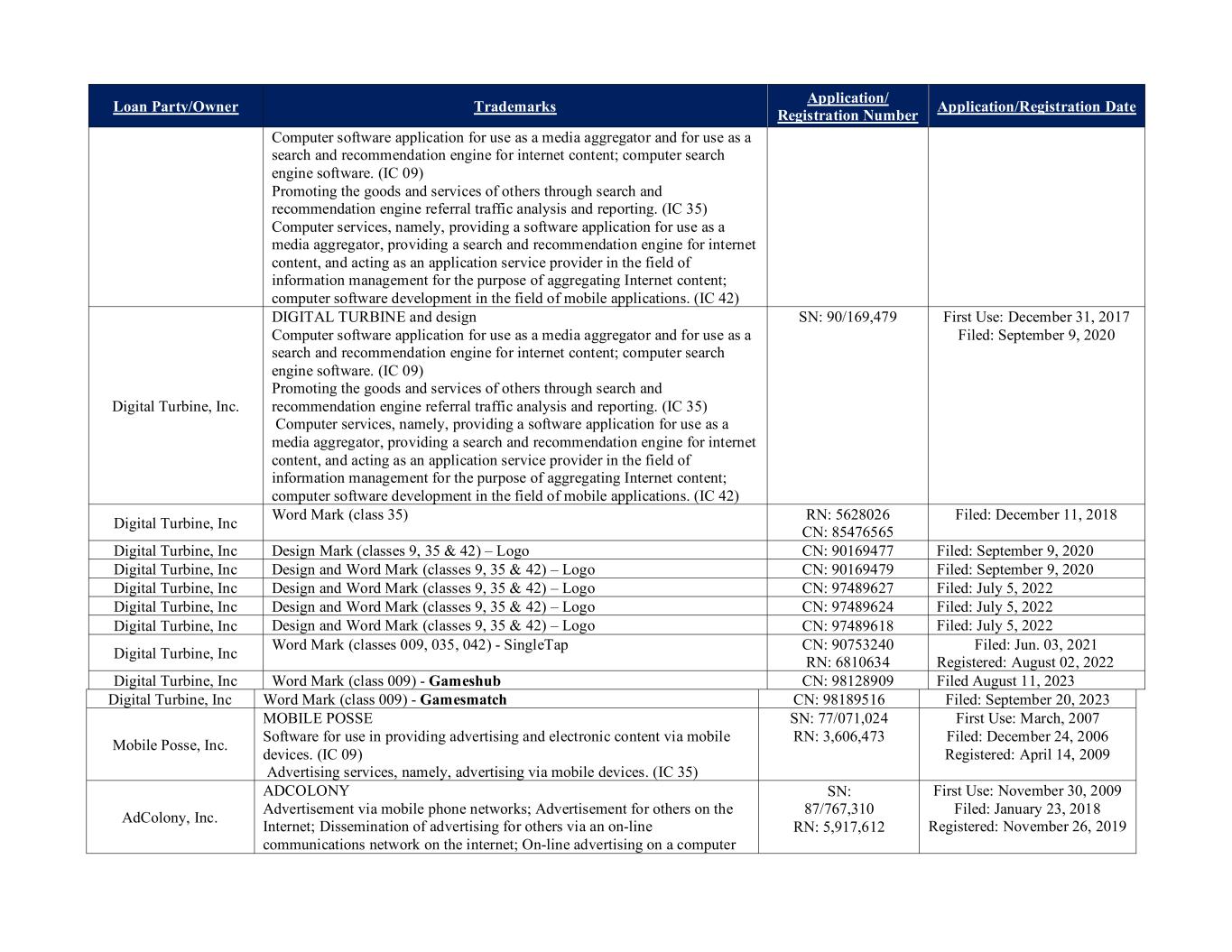 Loan Party/Owner Trademarks Application/ Registration Number Application/Registration Date Computer software application for use as a media aggregator and for use as a search and recommendation engine for internet content; computer search engine software. (IC 09) Promoting the goods and services of others through search and recommendation engine referral traffic analysis and reporting. (IC 35) Computer services, namely, providing a software application for use as a media aggregator, providing a search and recommendation engine for internet content, and acting as an application service provider in the field of information management for the purpose of aggregating Internet content; computer software development in the field of mobile applications. (IC 42) Digital Turbine, Inc. DIGITAL TURBINE and design Computer software application for use as a media aggregator and for use as a search and recommendation engine for internet content; computer search engine software. (IC 09) Promoting the goods and services of others through search and recommendation engine referral traffic analysis and reporting. (IC 35) Computer services, namely, providing a software application for use as a media aggregator, providing a search and recommendation engine for internet content, and acting as an application service provider in the field of information management for the purpose of aggregating Internet content; computer software development in the field of mobile applications. (IC 42) SN: 90/169,479 First Use: December 31, 2017 Filed: September 9, 2020 Digital Turbine, Inc Word Mark (class 35) RN: 5628026 CN: 85476565 Filed: December 11, 2018 Digital Turbine, Inc Design Mark (classes 9, 35 & 42) – Logo CN: 90169477 Filed: September 9, 2020 Digital Turbine, Inc Design and Word Mark (classes 9, 35 & 42) – Logo CN: 90169479 Filed: September 9, 2020 Digital Turbine, Inc Design and Word Mark (classes 9, 35 & 42) – Logo CN: 97489627 Filed: July 5, 2022 Digital Turbine, Inc Design and Word Mark (classes 9, 35 & 42) – Logo CN: 97489624 Filed: July 5, 2022 Digital Turbine, Inc Design and Word Mark (classes 9, 35 & 42) – Logo CN: 97489618 Filed: July 5, 2022 Digital Turbine, Inc Word Mark (classes 009, 035, 042) - SingleTap CN: 90753240 RN: 6810634 Filed: Jun. 03, 2021 Registered: August 02, 2022 Digital Turbine, Inc Word Mark (class 009) - Gameshub CN: 98128909 Filed August 11, 2023 Digital Turbine, Inc Word Mark (class 009) - Gamesmatch CN: 98189516 Filed: September 20, 2023 Mobile Posse, Inc. MOBILE POSSE Software for use in providing advertising and electronic content via mobile devices. (IC 09) Advertising services, namely, advertising via mobile devices. (IC 35) SN: 77/071,024 RN: 3,606,473 First Use: March, 2007 Filed: December 24, 2006 Registered: April 14, 2009 AdColony, Inc. ADCOLONY Advertisement via mobile phone networks; Advertisement for others on the Internet; Dissemination of advertising for others via an on-line communications network on the internet; On-line advertising on a computer SN: 87/767,310 RN: 5,917,612 First Use: November 30, 2009 Filed: January 23, 2018 Registered: November 26, 2019
