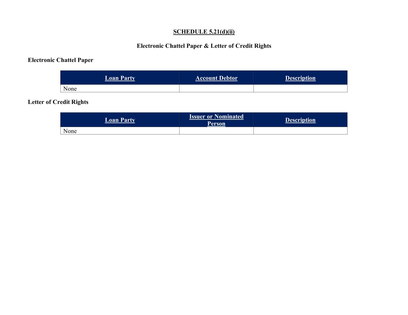 SCHEDULE 5.21(d)(ii) Electronic Chattel Paper & Letter of Credit Rights Electronic Chattel Paper Loan Party Account Debtor Description None Letter of Credit Rights Loan Party Issuer or Nominated Person Description None