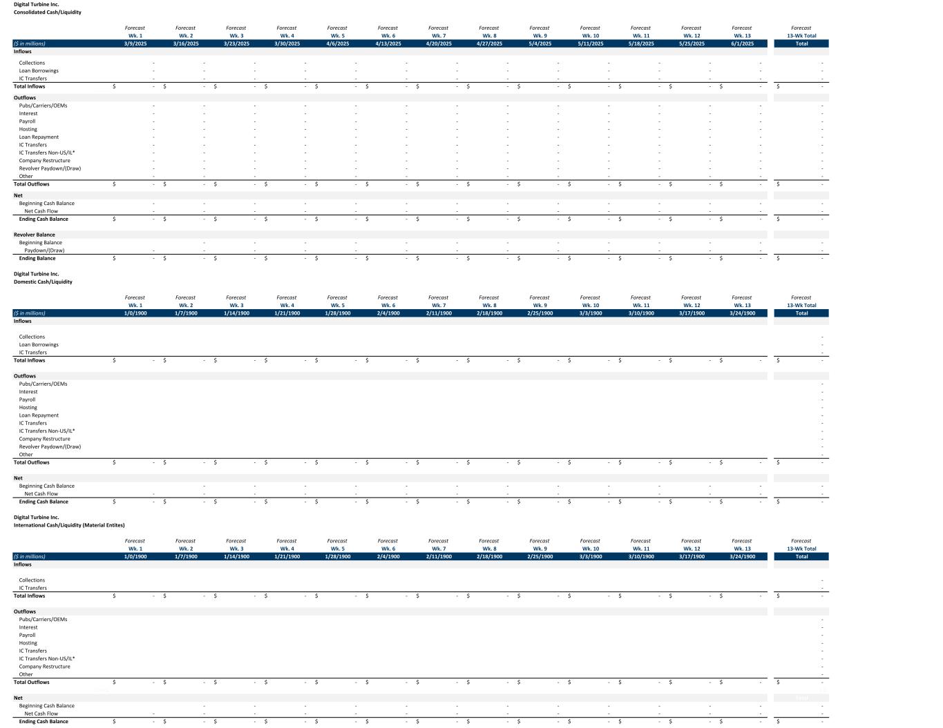 Digital Turbine Inc. Consolidated Cash/Liquidity Forecast Forecast Forecast Forecast Forecast Forecast Forecast Forecast Forecast Forecast Forecast Forecast Forecast Forecast Wk. 1 Wk. 2 Wk. 3 Wk. 4 Wk. 5 Wk. 6 Wk. 7 Wk. 8 Wk. 9 Wk. 10 Wk. 11 Wk. 12 Wk. 13 13-Wk Total ($ in millions) 3/9/2025 3/16/2025 3/23/2025 3/30/2025 4/6/2025 4/13/2025 4/20/2025 4/27/2025 5/4/2025 5/11/2025 5/18/2025 5/25/2025 6/1/2025 Total Inflows Collections - - - - - - - - - - - - - - Loan Borrowings - - - - - - - - - - - - - - IC Transfers - - - - - - - - - - - - - - Total Inflows -$ -$ -$ -$ -$ -$ -$ -$ -$ -$ -$ -$ -$ -$ Check Outflows Pubs/Carriers/OEMs - - - - - - - - - - - - - - Interest - - - - - - - - - - - - - - Payroll - - - - - - - - - - - - - - Hosting - - - - - - - - - - - - - - Loan Repayment - - - - - - - - - - - - - - IC Transfers - - - - - - - - - - - - - - IC Transfers Non-US/IL* - - - - - - - - - - - - - - Company Restructure - - - - - - - - - - - - - - Revolver Paydown/(Draw) - - - - - - - - - - - - - - Other - - - - - - - - - - - - - - Total Outflows -$ -$ -$ -$ -$ -$ -$ -$ -$ -$ -$ -$ -$ -$ Net Beginning Cash Balance - - - - - - - - - - - - - - Net Cash Flow - - - - - - - - - - - - - - Ending Cash Balance -$ -$ -$ -$ -$ -$ -$ -$ -$ -$ -$ -$ -$ -$ Revolver Balance Beginning Balance - - - - - - - - - - - - - Paydown/(Draw) - - - - - - - - - - - - - - Ending Balance -$ -$ -$ -$ -$ -$ -$ -$ -$ -$ -$ -$ -$ -$ Digital Turbine Inc. Domestic Cash/Liquidity Forecast Forecast Forecast Forecast Forecast Forecast Forecast Forecast Forecast Forecast Forecast Forecast Forecast Forecast Wk. 1 Wk. 2 Wk. 3 Wk. 4 Wk. 5 Wk. 6 Wk. 7 Wk. 8 Wk. 9 Wk. 10 Wk. 11 Wk. 12 Wk. 13 13-Wk Total ($ in millions) 1/0/1900 1/7/1900 1/14/1900 1/21/1900 1/28/1900 2/4/1900 2/11/1900 2/18/1900 2/25/1900 3/3/1900 3/10/1900 3/17/1900 3/24/1900 Total Inflows Collections - Loan Borrowings - IC Transfers - Total Inflows -$ -$ -$ -$ -$ -$ -$ -$ -$ -$ -$ -$ -$ -$ Outflows Pubs/Carriers/OEMs - Interest - Payroll - Hosting - Loan Repayment - IC Transfers - IC Transfers Non-US/IL* - Company Restructure - Revolver Paydown/(Draw) - Other - Total Outflows -$ -$ -$ -$ -$ -$ -$ -$ -$ -$ -$ -$ -$ -$ Net Beginning Cash Balance - - - - - - - - - - - - - Net Cash Flow - - - - - - - - - - - - - - Ending Cash Balance -$ -$ -$ -$ -$ -$ -$ -$ -$ -$ -$ -$ -$ -$ Digital Turbine Inc. International Cash/Liquidity (Material Entites) Forecast Forecast Forecast Forecast Forecast Forecast Forecast Forecast Forecast Forecast Forecast Forecast Forecast Forecast Wk. 1 Wk. 2 Wk. 3 Wk. 4 Wk. 5 Wk. 6 Wk. 7 Wk. 8 Wk. 9 Wk. 10 Wk. 11 Wk. 12 Wk. 13 13-Wk Total ($ in millions) 1/0/1900 1/7/1900 1/14/1900 1/21/1900 1/28/1900 2/4/1900 2/11/1900 2/18/1900 2/25/1900 3/3/1900 3/10/1900 3/17/1900 3/24/1900 Total Inflows Collections - IC Transfers - Total Inflows -$ -$ -$ -$ -$ -$ -$ -$ -$ -$ -$ -$ -$ -$ Outflows Pubs/Carriers/OEMs - Interest - Payroll - Hosting - IC Transfers - IC Transfers Non-US/IL* - Company Restructure - Other - Total Outflows -$ -$ -$ -$ -$ -$ -$ -$ -$ -$ -$ -$ -$ -$ Check 4.8 Net Total Beginning Cash Balance - - - - - - - - - - - - - Net Cash Flow - - - - - - - - - - - - - - Ending Cash Balance -$ -$ -$ -$ -$ -$ -$ -$ -$ -$ -$ -$ -$ -$
