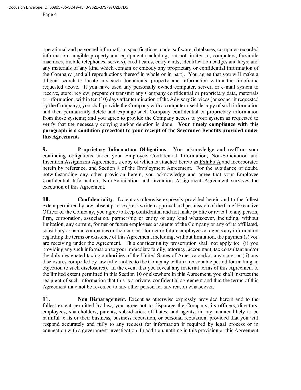 Page 4 operational and personnel information, specifications, code, software, databases, computer-recorded information, tangible property and equipment (including, but not limited to, computers, facsimile machines, mobile telephones, servers), credit cards, entry cards, identification badges and keys; and any materials of any kind which contain or embody any proprietary or confidential information of the Company (and all reproductions thereof in whole or in part). You agree that you will make a diligent search to locate any such documents, property and information within the timeframe requested above. If you have used any personally owned computer, server, or e-mail system to receive, store, review, prepare or transmit any Company confidential or proprietary data, materials or information, within ten (10) days after termination of the Advisory Services (or sooner if requested by the Company), you shall provide the Company with a computer-useable copy of such information and then permanently delete and expunge such Company confidential or proprietary information from those systems; and you agree to provide the Company access to your system as requested to verify that the necessary copying and/or deletion is done. Your timely compliance with this paragraph is a condition precedent to your receipt of the Severance Benefits provided under this Agreement. 9. Proprietary Information Obligations. You acknowledge and reaffirm your continuing obligations under your Employee Confidential Information; Non-Solicitation and Invention Assignment Agreement, a copy of which is attached hereto as Exhibit A and incorporated herein by reference, and Section 8 of the Employment Agreement. For the avoidance of doubt, notwithstanding any other provision herein, you acknowledge and agree that your Employee Confidential Information; Non-Solicitation and Invention Assignment Agreement survives the execution of this Agreement. 10. Confidentiality. Except as otherwise expressly provided herein and to the fullest extent permitted by law, absent prior express written approval and permission of the Chief Executive Officer of the Company, you agree to keep confidential and not make public or reveal to any person, firm, corporation, association, partnership or entity of any kind whatsoever, including, without limitation, any current, former or future employees or agents of the Company or any of its affiliated, subsidiary or parent companies or their current, former or future employees or agents any information regarding the terms or existence of this Agreement, including, without limitation, the payment(s) you are receiving under the Agreement. This confidentiality proscription shall not apply to: (i) you providing any such information to your immediate family, attorney, accountant, tax consultant and/or the duly designated taxing authorities of the United States of America and/or any state; or (ii) any disclosures compelled by law (after notice to the Company within a reasonable period for making an objection to such disclosures). In the event that you reveal any material terms of this Agreement to the limited extent permitted in this Section 10 or elsewhere in this Agreement, you shall instruct the recipient of such information that this is a private, confidential agreement and that the terms of this Agreement may not be revealed to any other person for any reason whatsoever. 11. Non Disparagement. Except as otherwise expressly provided herein and to the fullest extent permitted by law, you agree not to disparage the Company, its officers, directors, employees, shareholders, parents, subsidiaries, affiliates, and agents, in any manner likely to be harmful to its or their business, business reputation, or personal reputation; provided that you will respond accurately and fully to any request for information if required by legal process or in connection with a government investigation. In addition, nothing in this provision or this Agreement Docusign Envelope ID: 53995765-5C49-45F0-982E-879797C2D7D5