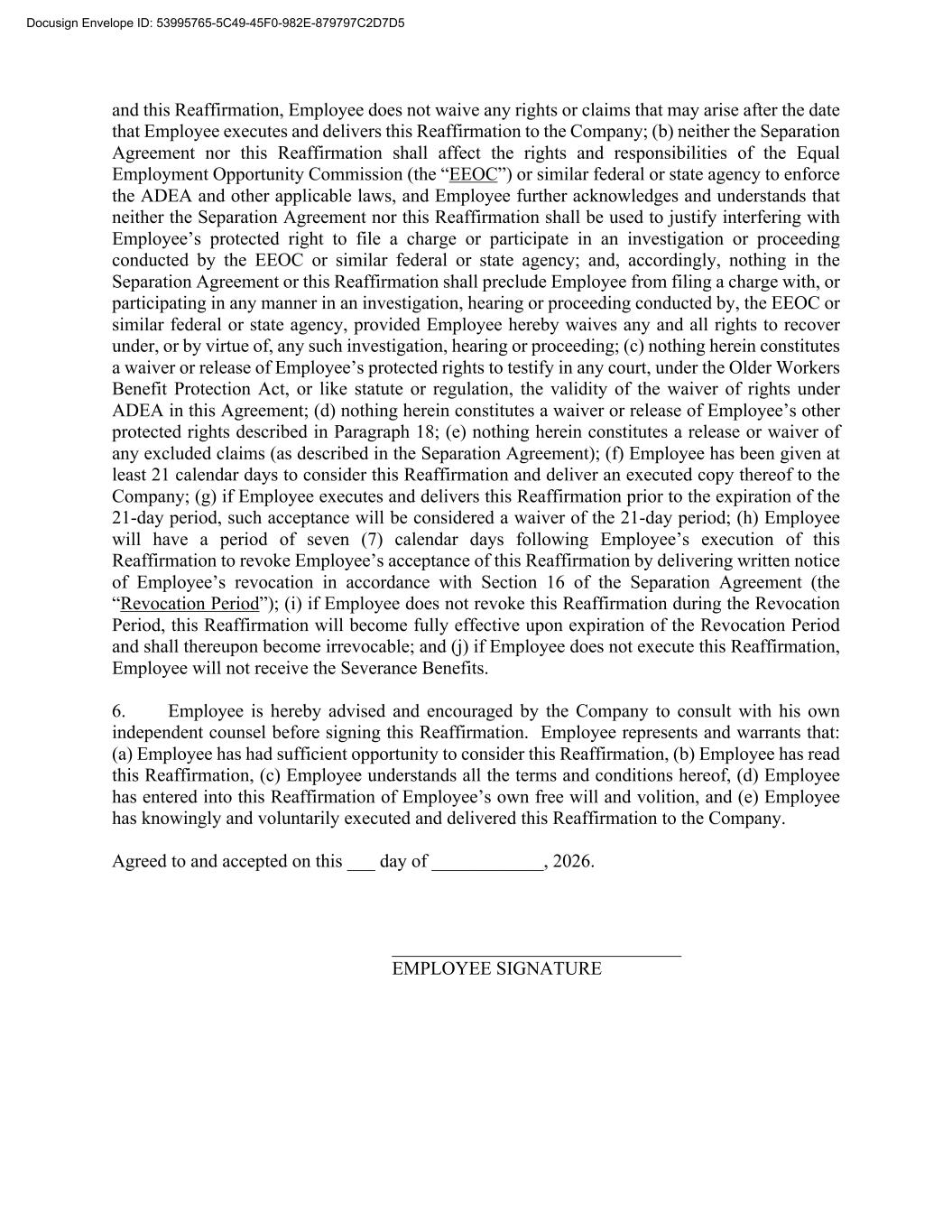 and this Reaffirmation, Employee does not waive any rights or claims that may arise after the date that Employee executes and delivers this Reaffirmation to the Company; (b) neither the Separation Agreement nor this Reaffirmation shall affect the rights and responsibilities of the Equal Employment Opportunity Commission (the “EEOC”) or similar federal or state agency to enforce the ADEA and other applicable laws, and Employee further acknowledges and understands that neither the Separation Agreement nor this Reaffirmation shall be used to justify interfering with Employee’s protected right to file a charge or participate in an investigation or proceeding conducted by the EEOC or similar federal or state agency; and, accordingly, nothing in the Separation Agreement or this Reaffirmation shall preclude Employee from filing a charge with, or participating in any manner in an investigation, hearing or proceeding conducted by, the EEOC or similar federal or state agency, provided Employee hereby waives any and all rights to recover under, or by virtue of, any such investigation, hearing or proceeding; (c) nothing herein constitutes a waiver or release of Employee’s protected rights to testify in any court, under the Older Workers Benefit Protection Act, or like statute or regulation, the validity of the waiver of rights under ADEA in this Agreement; (d) nothing herein constitutes a waiver or release of Employee’s other protected rights described in Paragraph 18; (e) nothing herein constitutes a release or waiver of any excluded claims (as described in the Separation Agreement); (f) Employee has been given at least 21 calendar days to consider this Reaffirmation and deliver an executed copy thereof to the Company; (g) if Employee executes and delivers this Reaffirmation prior to the expiration of the 21-day period, such acceptance will be considered a waiver of the 21-day period; (h) Employee will have a period of seven (7) calendar days following Employee’s execution of this Reaffirmation to revoke Employee’s acceptance of this Reaffirmation by delivering written notice of Employee’s revocation in accordance with Section 16 of the Separation Agreement (the “Revocation Period”); (i) if Employee does not revoke this Reaffirmation during the Revocation Period, this Reaffirmation will become fully effective upon expiration of the Revocation Period and shall thereupon become irrevocable; and (j) if Employee does not execute this Reaffirmation, Employee will not receive the Severance Benefits. 6. Employee is hereby advised and encouraged by the Company to consult with his own independent counsel before signing this Reaffirmation. Employee represents and warrants that: (a) Employee has had sufficient opportunity to consider this Reaffirmation, (b) Employee has read this Reaffirmation, (c) Employee understands all the terms and conditions hereof, (d) Employee has entered into this Reaffirmation of Employee’s own free will and volition, and (e) Employee has knowingly and voluntarily executed and delivered this Reaffirmation to the Company. Agreed to and accepted on this ___ day of ____________, 2026. _______________________________ EMPLOYEE SIGNATURE Docusign Envelope ID: 53995765-5C49-45F0-982E-879797C2D7D5