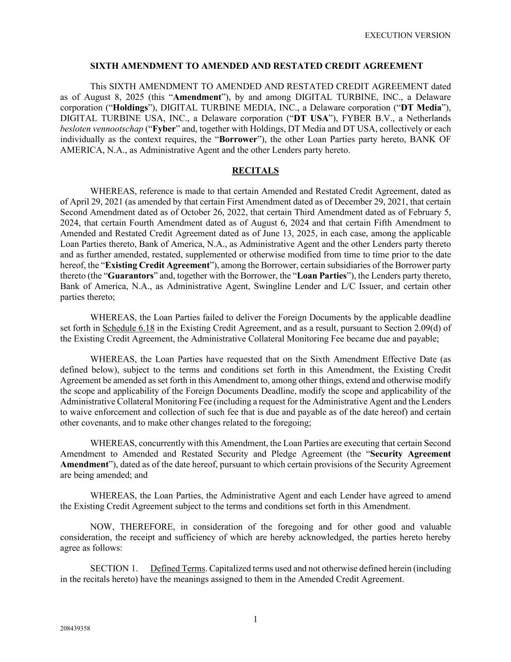 EXECUTION VERSION 1 208439358 SIXTH AMENDMENT TO AMENDED AND RESTATED CREDIT AGREEMENT This SIXTH AMENDMENT TO AMENDED AND RESTATED CREDIT AGREEMENT dated as of August 8, 2025 (this “Amendment”), by and among DIGITAL TURBINE, INC., a Delaware corporation (“Holdings”), DIGITAL TURBINE MEDIA, INC., a Delaware corporation (“DT Media”), DIGITAL TURBINE USA, INC., a Delaware corporation (“DT USA”), FYBER B.V., a Netherlands besloten vennootschap (“Fyber” and, together with Holdings, DT Media and DT USA, collectively or each individually as the context requires, the “Borrower”), the other Loan Parties party hereto, BANK OF AMERICA, N.A., as Administrative Agent and the other Lenders party hereto. RECITALS WHEREAS, reference is made to that certain Amended and Restated Credit Agreement, dated as of April 29, 2021 (as amended by that certain First Amendment dated as of December 29, 2021, that certain Second Amendment dated as of October 26, 2022, that certain Third Amendment dated as of February 5, 2024, that certain Fourth Amendment dated as of August 6, 2024 and that certain Fifth Amendment to Amended and Restated Credit Agreement dated as of June 13, 2025, in each case, among the applicable Loan Parties thereto, Bank of America, N.A., as Administrative Agent and the other Lenders party thereto and as further amended, restated, supplemented or otherwise modified from time to time prior to the date hereof, the “Existing Credit Agreement”), among the Borrower, certain subsidiaries of the Borrower party thereto (the “Guarantors” and, together with the Borrower, the “Loan Parties”), the Lenders party thereto, Bank of America, N.A., as Administrative Agent, Swingline Lender and L/C Issuer, and certain other parties thereto; WHEREAS, the Loan Parties failed to deliver the Foreign Documents by the applicable deadline set forth in Schedule 6.18 in the Existing Credit Agreement, and as a result, pursuant to Section 2.09(d) of the Existing Credit Agreement, the Administrative Collateral Monitoring Fee became due and payable; WHEREAS, the Loan Parties have requested that on the Sixth Amendment Effective Date (as defined below), subject to the terms and conditions set forth in this Amendment, the Existing Credit Agreement be amended as set forth in this Amendment to, among other things, extend and otherwise modify the scope and applicability of the Foreign Documents Deadline, modify the scope and applicability of the Administrative Collateral Monitoring Fee (including a request for the Administrative Agent and the Lenders to waive enforcement and collection of such fee that is due and payable as of the date hereof) and certain other covenants, and to make other changes related to the foregoing; WHEREAS, concurrently with this Amendment, the Loan Parties are executing that certain Second Amendment to Amended and Restated Security and Pledge Agreement (the “Security Agreement Amendment”), dated as of the date hereof, pursuant to which certain provisions of the Security Agreement are being amended; and WHEREAS, the Loan Parties, the Administrative Agent and each Lender have agreed to amend the Existing Credit Agreement subject to the terms and conditions set forth in this Amendment. NOW, THEREFORE, in consideration of the foregoing and for other good and valuable consideration, the receipt and sufficiency of which are hereby acknowledged, the parties hereto hereby agree as follows: SECTION 1. Defined Terms. Capitalized terms used and not otherwise defined herein (including in the recitals hereto) have the meanings assigned to them in the Amended Credit Agreement.