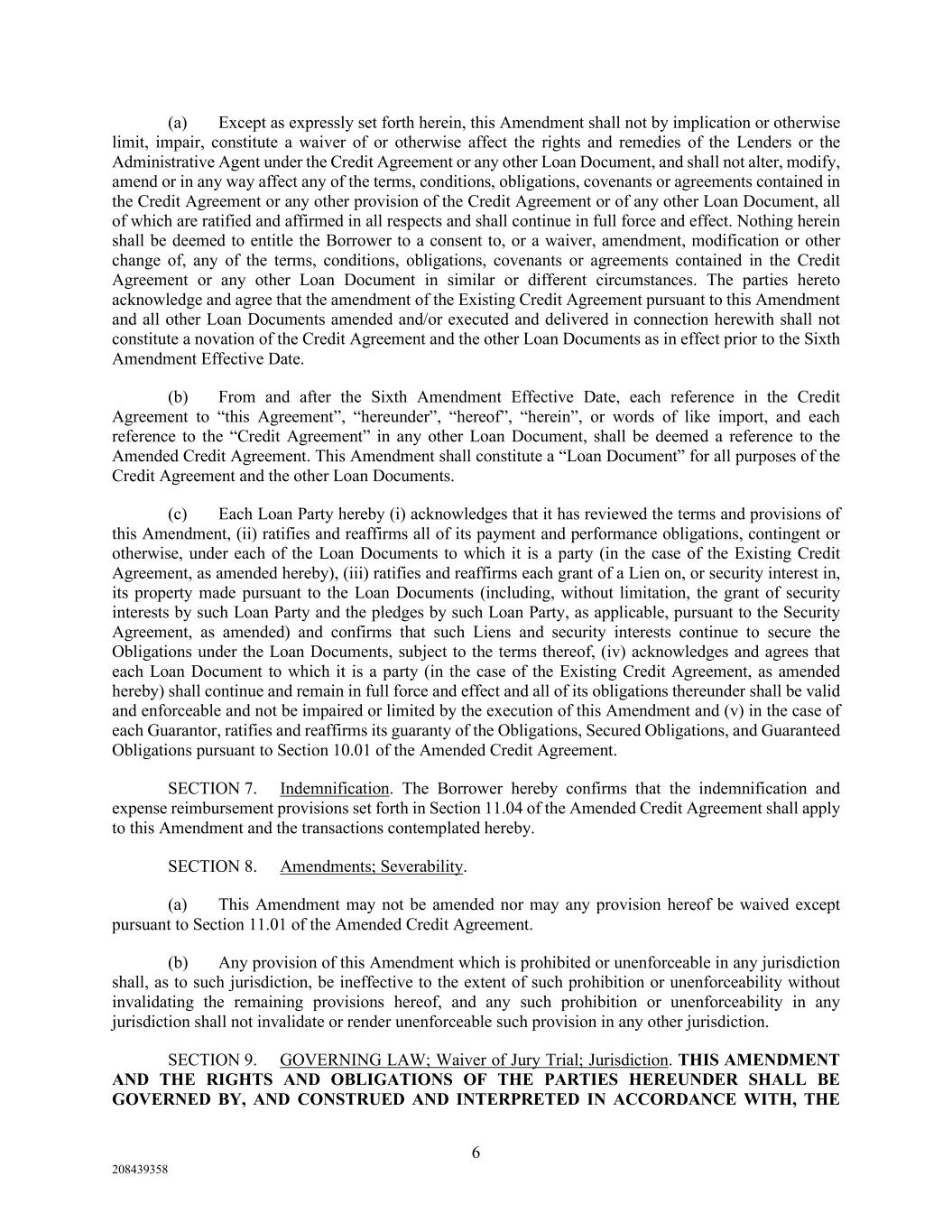 6 208439358 (a) Except as expressly set forth herein, this Amendment shall not by implication or otherwise limit, impair, constitute a waiver of or otherwise affect the rights and remedies of the Lenders or the Administrative Agent under the Credit Agreement or any other Loan Document, and shall not alter, modify, amend or in any way affect any of the terms, conditions, obligations, covenants or agreements contained in the Credit Agreement or any other provision of the Credit Agreement or of any other Loan Document, all of which are ratified and affirmed in all respects and shall continue in full force and effect. Nothing herein shall be deemed to entitle the Borrower to a consent to, or a waiver, amendment, modification or other change of, any of the terms, conditions, obligations, covenants or agreements contained in the Credit Agreement or any other Loan Document in similar or different circumstances. The parties hereto acknowledge and agree that the amendment of the Existing Credit Agreement pursuant to this Amendment and all other Loan Documents amended and/or executed and delivered in connection herewith shall not constitute a novation of the Credit Agreement and the other Loan Documents as in effect prior to the Sixth Amendment Effective Date. (b) From and after the Sixth Amendment Effective Date, each reference in the Credit Agreement to “this Agreement”, “hereunder”, “hereof”, “herein”, or words of like import, and each reference to the “Credit Agreement” in any other Loan Document, shall be deemed a reference to the Amended Credit Agreement. This Amendment shall constitute a “Loan Document” for all purposes of the Credit Agreement and the other Loan Documents. (c) Each Loan Party hereby (i) acknowledges that it has reviewed the terms and provisions of this Amendment, (ii) ratifies and reaffirms all of its payment and performance obligations, contingent or otherwise, under each of the Loan Documents to which it is a party (in the case of the Existing Credit Agreement, as amended hereby), (iii) ratifies and reaffirms each grant of a Lien on, or security interest in, its property made pursuant to the Loan Documents (including, without limitation, the grant of security interests by such Loan Party and the pledges by such Loan Party, as applicable, pursuant to the Security Agreement, as amended) and confirms that such Liens and security interests continue to secure the Obligations under the Loan Documents, subject to the terms thereof, (iv) acknowledges and agrees that each Loan Document to which it is a party (in the case of the Existing Credit Agreement, as amended hereby) shall continue and remain in full force and effect and all of its obligations thereunder shall be valid and enforceable and not be impaired or limited by the execution of this Amendment and (v) in the case of each Guarantor, ratifies and reaffirms its guaranty of the Obligations, Secured Obligations, and Guaranteed Obligations pursuant to Section 10.01 of the Amended Credit Agreement. SECTION 7. Indemnification. The Borrower hereby confirms that the indemnification and expense reimbursement provisions set forth in Section 11.04 of the Amended Credit Agreement shall apply to this Amendment and the transactions contemplated hereby. SECTION 8. Amendments; Severability. (a) This Amendment may not be amended nor may any provision hereof be waived except pursuant to Section 11.01 of the Amended Credit Agreement. (b) Any provision of this Amendment which is prohibited or unenforceable in any jurisdiction shall, as to such jurisdiction, be ineffective to the extent of such prohibition or unenforceability without invalidating the remaining provisions hereof, and any such prohibition or unenforceability in any jurisdiction shall not invalidate or render unenforceable such provision in any other jurisdiction. SECTION 9. GOVERNING LAW; Waiver of Jury Trial; Jurisdiction. THIS AMENDMENT AND THE RIGHTS AND OBLIGATIONS OF THE PARTIES HEREUNDER SHALL BE GOVERNED BY, AND CONSTRUED AND INTERPRETED IN ACCORDANCE WITH, THE