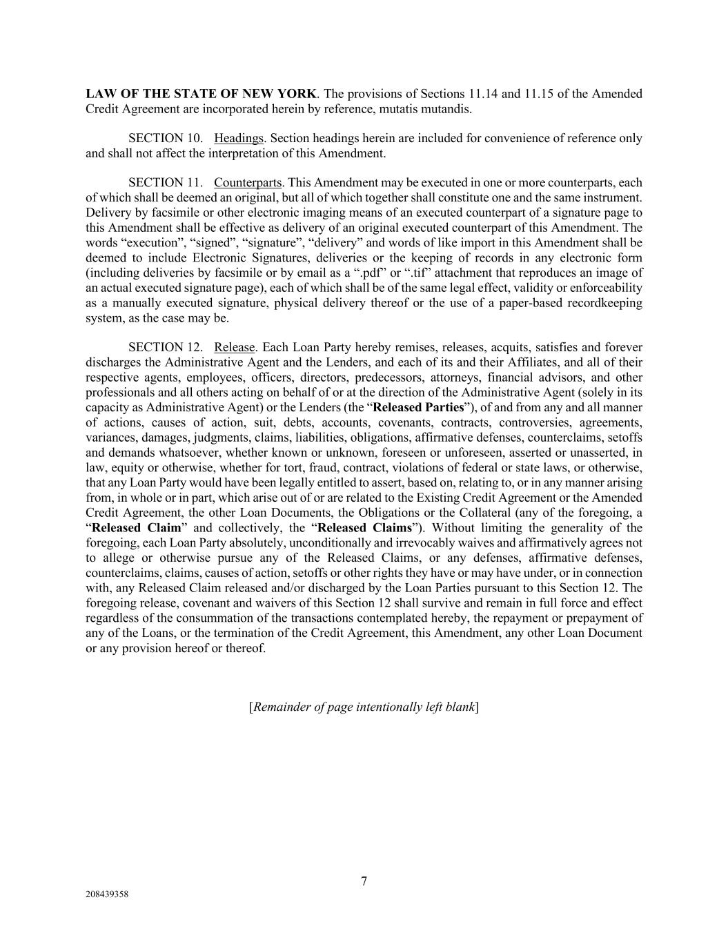 7 208439358 LAW OF THE STATE OF NEW YORK. The provisions of Sections 11.14 and 11.15 of the Amended Credit Agreement are incorporated herein by reference, mutatis mutandis. SECTION 10. Headings. Section headings herein are included for convenience of reference only and shall not affect the interpretation of this Amendment. SECTION 11. Counterparts. This Amendment may be executed in one or more counterparts, each of which shall be deemed an original, but all of which together shall constitute one and the same instrument. Delivery by facsimile or other electronic imaging means of an executed counterpart of a signature page to this Amendment shall be effective as delivery of an original executed counterpart of this Amendment. The words “execution”, “signed”, “signature”, “delivery” and words of like import in this Amendment shall be deemed to include Electronic Signatures, deliveries or the keeping of records in any electronic form (including deliveries by facsimile or by email as a “.pdf” or “.tif” attachment that reproduces an image of an actual executed signature page), each of which shall be of the same legal effect, validity or enforceability as a manually executed signature, physical delivery thereof or the use of a paper-based recordkeeping system, as the case may be. SECTION 12. Release. Each Loan Party hereby remises, releases, acquits, satisfies and forever discharges the Administrative Agent and the Lenders, and each of its and their Affiliates, and all of their respective agents, employees, officers, directors, predecessors, attorneys, financial advisors, and other professionals and all others acting on behalf of or at the direction of the Administrative Agent (solely in its capacity as Administrative Agent) or the Lenders (the “Released Parties”), of and from any and all manner of actions, causes of action, suit, debts, accounts, covenants, contracts, controversies, agreements, variances, damages, judgments, claims, liabilities, obligations, affirmative defenses, counterclaims, setoffs and demands whatsoever, whether known or unknown, foreseen or unforeseen, asserted or unasserted, in law, equity or otherwise, whether for tort, fraud, contract, violations of federal or state laws, or otherwise, that any Loan Party would have been legally entitled to assert, based on, relating to, or in any manner arising from, in whole or in part, which arise out of or are related to the Existing Credit Agreement or the Amended Credit Agreement, the other Loan Documents, the Obligations or the Collateral (any of the foregoing, a “Released Claim” and collectively, the “Released Claims”). Without limiting the generality of the foregoing, each Loan Party absolutely, unconditionally and irrevocably waives and affirmatively agrees not to allege or otherwise pursue any of the Released Claims, or any defenses, affirmative defenses, counterclaims, claims, causes of action, setoffs or other rights they have or may have under, or in connection with, any Released Claim released and/or discharged by the Loan Parties pursuant to this Section 12. The foregoing release, covenant and waivers of this Section 12 shall survive and remain in full force and effect regardless of the consummation of the transactions contemplated hereby, the repayment or prepayment of any of the Loans, or the termination of the Credit Agreement, this Amendment, any other Loan Document or any provision hereof or thereof. [Remainder of page intentionally left blank]