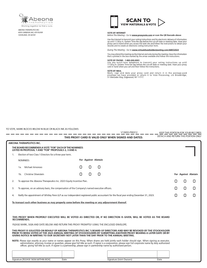 You are cordially invited to attend the Annual Meeting of Stockholders (the “Annual Meeting”) of Abeona Therapeutics Inc. (the “Company”) to be held virtually on Wednesday, May 17, 2023 at 9:00 a.m., Eastern Time. Our Annual Meeting will be held in a virtual format only. You will be able to attend the Annual Meeting, vote and submit your questions during the Annual Meeting via a live webcast through the link www.virtualshareholdermeeting.com/ABEO2023.