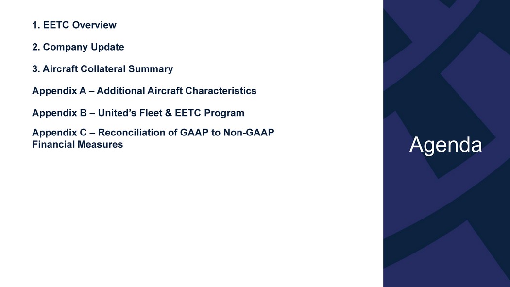 Agenda 2. Company Update 3. Aircraft Collateral Summary 1. EETC Overview Appendix A – Additional Aircraft Characteristics Appendix B – United’s Fleet & EETC Program Appendix C – Reconciliation of GAAP to Non - GAAP Financial Measures