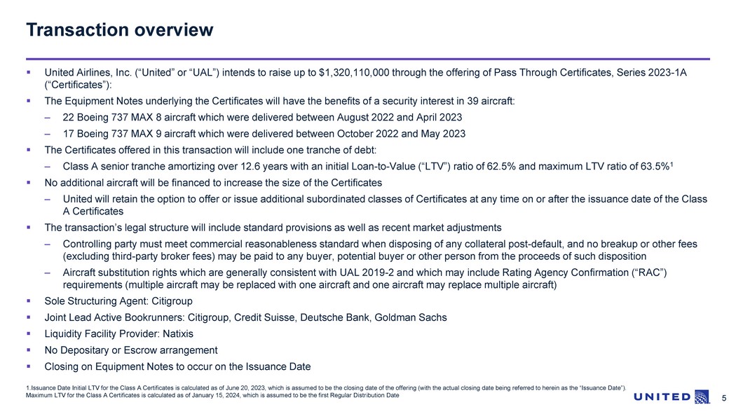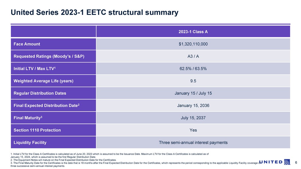 5 1.Issuance Date Initial LTV for the Class A Certificates is calculated as of June 20, 2023, which is assumed to be the closin g d ate of the offering (with the actual closing date being referred to herein as the “Issuance Date”). Maximum LTV for the Class A Certificates is calculated as of January 15, 2024, which is assumed to be the first Regular Distr ibu tion Date ▪ United Airlines, Inc. (“United” or “UAL”) intends to raise up to $1,320,110,000 through the offering of Pass Through Certific ate s, Series 2023 - 1A (“Certificates”): ▪ The Equipment Notes underlying the Certificates will have the benefits of a security interest in 39 aircraft: – 22 Boeing 737 MAX 8 aircraft which were delivered between August 2022 and April 2023 – 17 Boeing 737 MAX 9 aircraft which were delivered between October 2022 and May 2023 ▪ The Certificates offered in this transaction will include one tranche of debt: – Class A senior tranche amortizing over 12.6 years with an initial Loan - to - Value (“LTV”) ratio of 62.5% and maximum LTV ratio of 63.5% 1 ▪ No additional aircraft will be financed to increase the size of the Certificates – United will retain the option to offer or issue additional subordinated classes of Certificates at any time on or after the i ssu ance date of the Class A Certificates ▪ The transaction’s legal structure will include standard provisions as well as recent market adjustments – Controlling party must meet commercial reasonableness standard when disposing of any collateral post - default, and no breakup or other fees (excluding third - party broker fees) may be paid to any buyer, potential buyer or other person from the proceeds of such disposit ion – Aircraft substitution rights which are generally consistent with UAL 2019 - 2 and which may include Rating Agency Confirmation (“R AC”) requirements (multiple aircraft may be replaced with one aircraft and one aircraft may replace multiple aircraft) ▪ Sole Structuring Agent: Citigroup ▪ Joint Lead Active Bookrunners: Citigroup, Credit Suisse, Deutsche Bank, Goldman Sachs ▪ Liquidity Facility Provider: Natixis ▪ No Depositary or Escrow arrangement ▪ Closing on Equipment Notes to occur on the Issuance Date Transaction overview