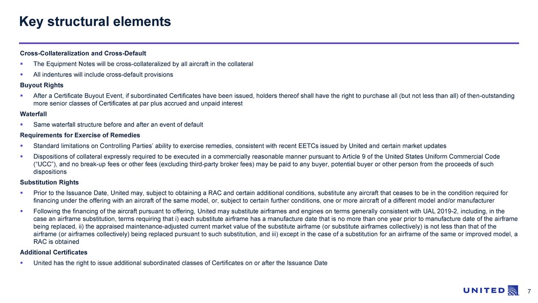 6 United Series 2023 - 1 EETC structural summary 2023 - 1 Class A Face Amount $1,320,110,000 Requested Ratings (Moody’s / S&P) A3 / A Initial LTV / Max LTV 1 62.5% / 63.5% Weighted Average Life (years) 9.5 Regular Distribution Dates January 15 / July 15 Final Expected Distribution Date 2 January 15 , 2036 Final Maturity 3 July 15, 2037 Section 1110 Protection Yes Liquidity Facility Three semi - annual interest payments 1. Initial LTV for the Class A Certificates is calculated as of June 20, 2023 which is assumed to be the Issuance Date. Maxim um LTV for the Class A Certificates is calculated as of January 15, 2024, which is assumed to be the first Regular Distribution Date. 2. The Equipment Notes will mature on the Final Expected Distribution Date for the Certificates. 3. The Final Maturity Date for the Certificates is the date that is 18 months after the Final Expected Distribution Date for the Certificates, which represents the period corresponding to the applicable Liquidity Facility coverage of three successive semi - annual interest payments.