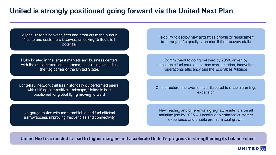 9 United is strongly positioned going forward via the United Next Plan United Next is expected to lead to higher margins and accelerate United’s progress in strengthening its balance sheet Aligns United’s network, fleet and products to the hubs it flies to and customers it serves, unlocking United’s full potential Hubs located in the largest markets and business centers with the most international demand, positioning United as the flag carrier of the United States Long - haul network that has historically outperformed peers ; with shifting competitive landscape, United is best positioned for global flying moving forward Up - gauge routes with more profitable and fuel efficient narrowbodies, improving frequencies and connectivity Cost structure improvements anticipated to enable earnings expansion Flexibility to deploy new aircraft as growth or replacement for a range of capacity scenarios if the recovery stalls New leading and differentiating signature interiors on all mainline jets by 2025 will continue to enhance customer experience and enable premium seat growth Commitment to going net zero by 2050, driven by sustainable fuel sources, carbon sequestration, innovation, operational efficiency and the Eco - Skies Alliance