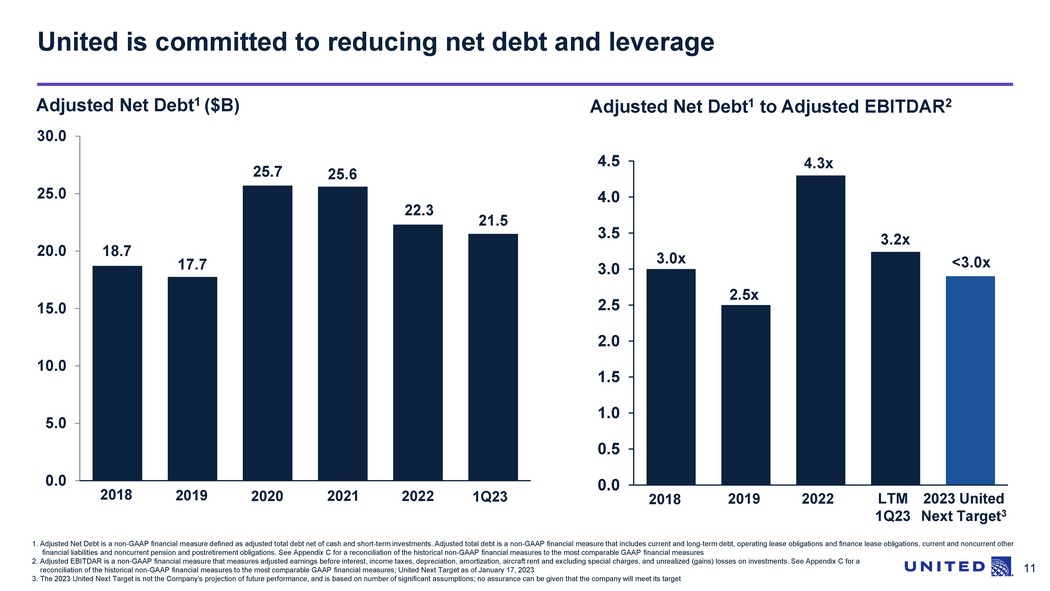 10 United has bolstered liquidity through efficient mix of debt issuances 2026 2025 2023 3.4 2024 2027 5.2 2.9 3.9 2.4 Annual debt payments ($B) 2 1. Source: Form 10 - Q for United Airlines Holdings, Inc. for quarterly period ended March 31, 2023 2. Source: Form 10 - K for United Airlines Holdings, Inc. for fiscal year ended December 31, 2022 9.5 7.6 1.8 18.9 Short - term investments Cash & cash equivalents Undrawn revolver Liquidity ($B) 1 ▪ United maintains strong liquidity profile – nearly $19B as of Q1 2023 ▪ United invests its cash conservatively predominantly through U.S. Treasuries and government money market funds ▪ Cash & cash equivalents provide daily liquidity source ▪ $1.75B undrawn and available under revolving credit facility Manageable upcoming debt amortization schedule
