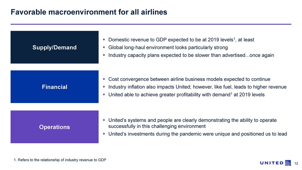 11 United is committed to reducing net debt and leverage 18.7 17.7 25.7 0.0 5.0 10.0 15.0 20.0 25.0 30.0 2019 2020 2021 25.6 Adjusted Net Debt 1 ($B) Adjusted Net Debt 1 to Adjusted EBITDAR 2 0.0 0.5 1.0 1.5 2.0 2.5 3.0 3.5 4.0 4.5 2022 2018 2.5x 3.0x 2023 United Next Target 3 2018 1. Adjusted Net D ebt is a non - GAAP financial measure defined as adjusted total debt net of cash and short - term investments. Adjusted total debt is a non - GAAP financial measure that includes current and long - term debt, operating lease obligations and finance lease obligations, current and noncurrent other financial liabilities and noncurrent pension and postretirement obligations. See Appendix C for a reconciliation of the histo ri cal non - GAAP financial measures to the most comparable GAAP financial measures 2. Adjusted EBITDAR is a non - GAAP financial measure that measures adjusted earnings before interest, income taxes, depreciation, am ortization, aircraft rent and excluding special charges, and unrealized (gains) losses on investments. See Appendix C for a reconciliation of the historical non - GAAP financial measures to the most comparable GAAP financial measures; United Next Tar get as of January 17, 2023 3. The 2023 United Next Target is not the Company’s projection of future performance, and is based on number of significant a ssu mptions; no assurance can be given that the company will meet its target 2022 22.3 4.3x < 3.0x 2019 21.5 1Q23 LTM 1Q23 3.2x