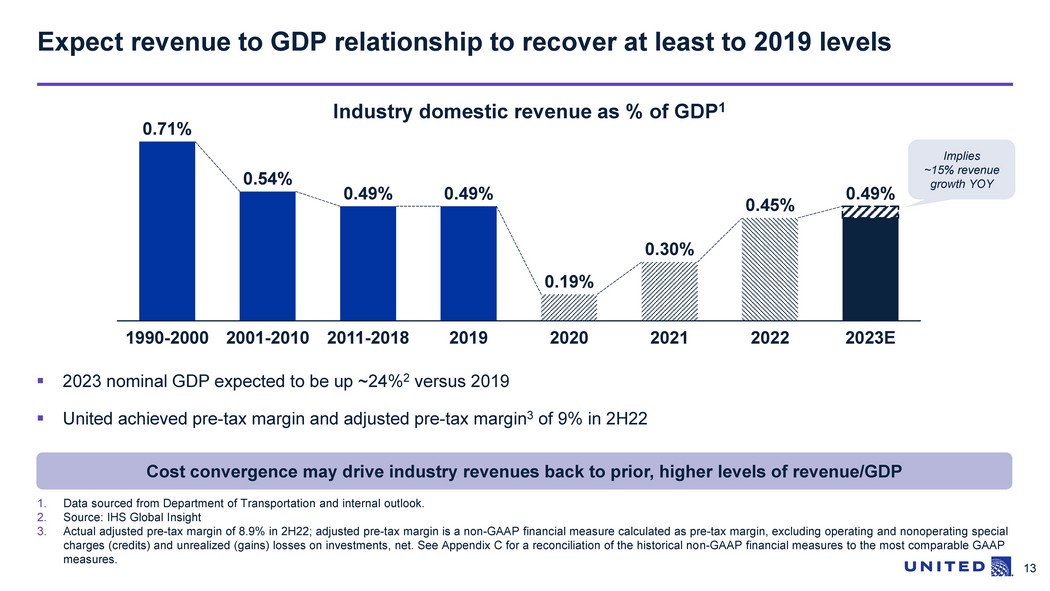 12 Favorable macroenvironment for all airlines ▪ Domestic revenue to GDP expected to be at 2019 levels 1 , at least ▪ Global long - haul environment looks particularly strong ▪ Industry capacity plans expected to be slower than advertised...once again Supply/Demand Financial Operations ▪ Cost convergence between airline business models expected to continue ▪ Industry inflation also impacts United; however, like fuel, leads to higher revenue ▪ United able to achieve greater profitability with demand 1 at 2019 levels ▪ United’s systems and people are clearly demonstrating the ability to operate successfully in this challenging environment ▪ United’s investments during the pandemic were unique and positioned us to lead 1. Refers to the relationship of industry revenue to GDP