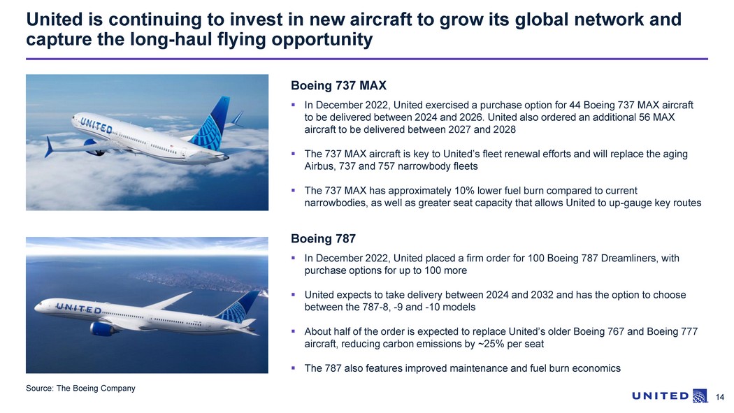 13 Expect revenue to GDP relationship to recover at least to 2019 levels ▪ 2023 nominal GDP expected to be up ~24% 2 versus 2019 ▪ United achieved pre - tax margin and adjusted pre - tax margin 3 of 9% in 2H22 2022 2021 2020 2019 2011 - 2018 2001 - 2010 2023E 0.71 % 0.54% 0.49% 0.49% 0.19% 0.30% 0.45% 0.49% 1990 - 2000 Industry domestic revenue as % of GDP 1 1. Data sourced from Department of Transportation and internal outlook. 2. Source: IHS Global Insight 3. Actual adjusted pre - tax margin of 8.9% in 2H22; adjusted pre - tax margin is a non - GAAP financial measure calculated as pre - tax ma rgin, excluding operating and nonoperating special charges (credits) and unrealized (gains) losses on investments, net. See Appendix C for a reconciliation of the historical no n - G AAP financial measures to the most comparable GAAP measures. Implies ~15% revenue growth YOY Cost convergence may drive i ndustry revenues back to prior, higher levels of revenue/GDP