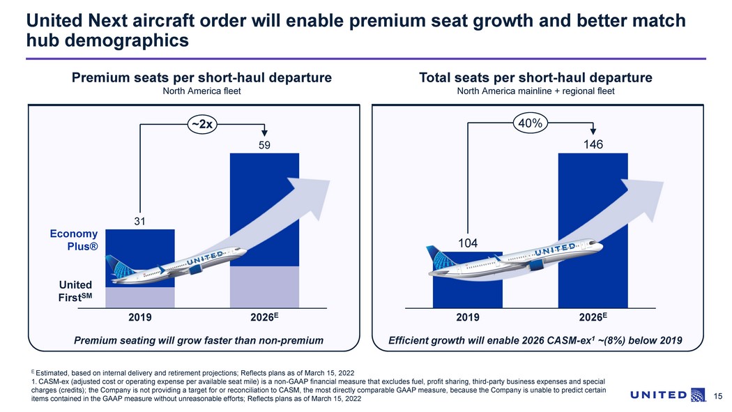 14 United is continuing to invest in new aircraft to grow its global network and capture the long - haul flying opportunity Boeing 737 MAX ▪ In December 2022, United exercised a purchase option for 44 Boeing 737 MAX aircraft to be delivered between 2024 and 2026. United also ordered an additional 56 MAX aircraft to be delivered between 2027 and 2028 ▪ The 737 MAX aircraft is key to United’s fleet renewal efforts and will replace the aging Airbus, 737 and 757 narrowbody fleets ▪ The 737 MAX has approximately 10% lower fuel burn compared to current narrowbodies, as well as greater seat capacity that allows United to up - gauge key routes Source: The Boeing Company Boeing 787 ▪ In December 2022, United placed a firm order for 100 Boeing 787 Dreamliners, with purchase options for up to 100 more ▪ United expects to take delivery between 2024 and 2032 and has the option to choose between the 787 - 8, - 9 and - 10 models ▪ About half of the order is expected to replace United’s older Boeing 767 and Boeing 777 aircraft, reducing carbon emissions by ~25% per seat ▪ The 787 also features improved maintenance and fuel burn economics