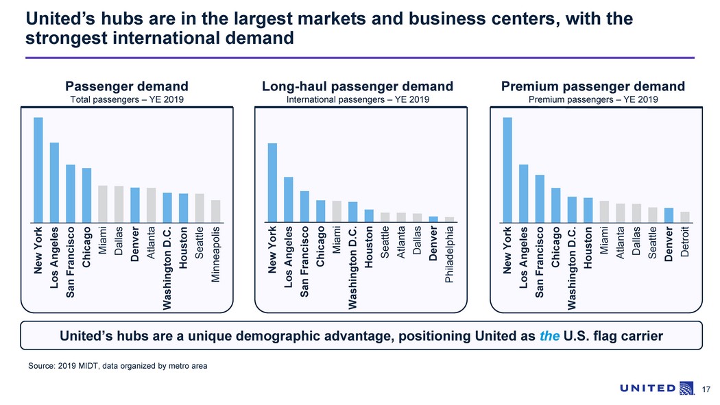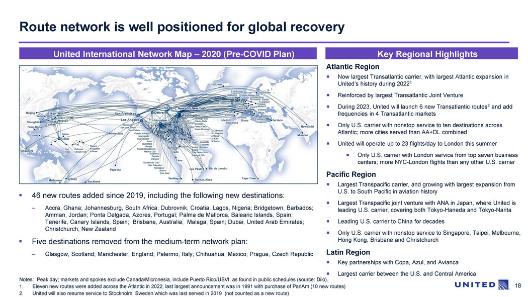17 United’s hubs are in the largest markets and business centers, with the strongest international demand New York Chicago Los Angeles Atlanta San Francisco Miami Denver Dallas Washington D.C. Houston Seattle Minneapolis Passenger demand Total passengers – YE 2019 United’s hubs are a unique demographic advantage, positioning United as the U.S. flag carrier Miami San Francisco Seattle Chicago New York Los Angeles Washington D.C. Houston Atlanta Dallas Denver Philadelphia Long - haul passenger demand International passengers – YE 2019 Washington D.C. San Francisco New York Los Angeles Chicago Houston Miami Atlanta Dallas Seattle Denver Detroit Premium passenger demand Premium passengers – YE 2019 Source: 2019 MIDT, data organized by metro area