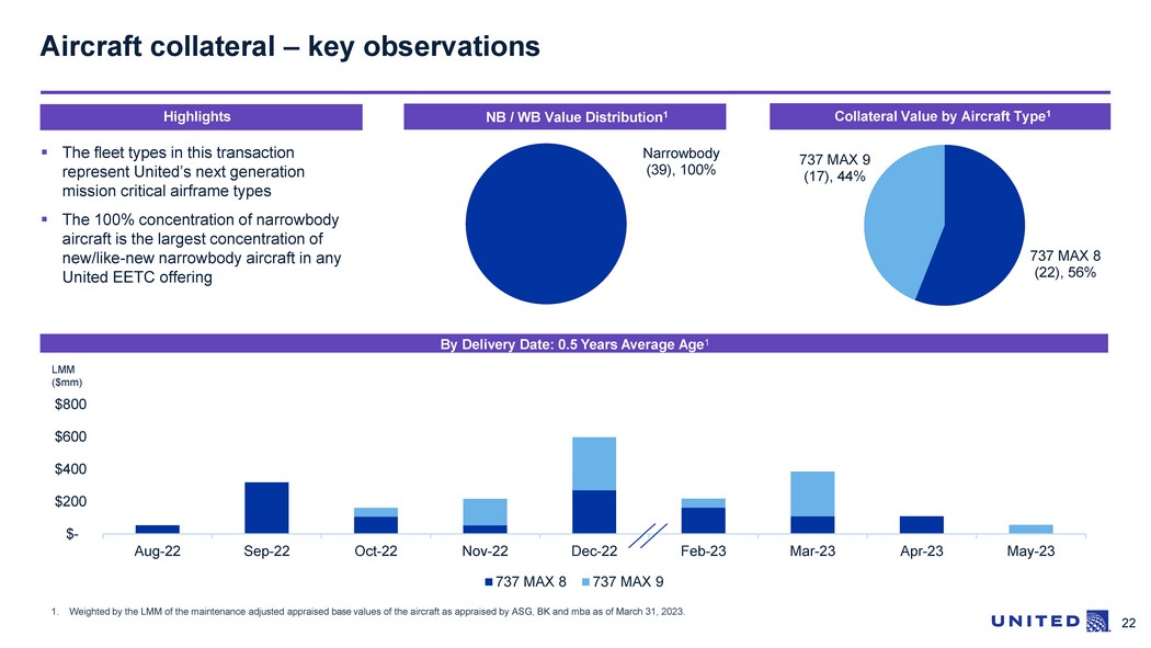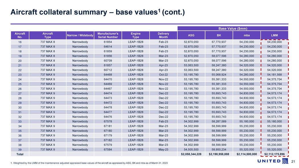 20 Base Value ($mm) Aircraft No. Aircraft Type Narrow / Widebody Manufacturer's Serial Number Engine Type Delivery Month ASG BK mba LMM 1 737 MAX 8 Narrowbody 67523 LEAP - 1B28 Aug - 22 51,288,214 54,484,212 52,800,000 52,800,000 2 737 MAX 8 Narrowbody 67526 LEAP - 1B28 Sep - 22 51,288,214 54,790,871 53,080,000 53,053,028 3 737 MAX 8 Narrowbody 67524 LEAP - 1B28 Sep - 22 51,288,214 54,790,871 53,080,000 53,053,028 4 737 MAX 8 Narrowbody 64610 LEAP - 1B28 Sep - 22 51,288,214 54,790,871 53,080,000 53,053,028 5 737 MAX 8 Narrowbody 67525 LEAP - 1B28 Sep - 22 51,288,214 54,790,871 53,080,000 53,053,028 6 737 MAX 8 Narrowbody 67522 LEAP - 1B28 Sep - 22 51,288,214 54,790,871 53,080,000 53,053,028 7 737 MAX 8 Narrowbody 67527 LEAP - 1B28 Sep - 22 51,288,214 54,790,871 53,080,000 53,053,028 8 737 MAX 8 Narrowbody 67528 LEAP - 1B28 Oct - 22 52,071,024 55,097,530 53,350,000 53,350,000 9 737 MAX 8 Narrowbody 62535 LEAP - 1B28 Oct - 22 52,071,024 55,097,530 53,350,000 53,350,000 10 737 MAX 8 Narrowbody 64612 LEAP - 1B28 Nov - 22 52,071,024 55,404,189 53,620,000 53,620,000 11 737 MAX 8 Narrowbody 61861 LEAP - 1B28 Dec - 22 52,071,024 55,710,848 53,890,000 53,890,000 12 737 MAX 8 Narrowbody 61863 LEAP - 1B28 Dec - 22 52,071,024 55,710,848 53,890,000 53,890,000 13 737 MAX 8 Narrowbody 64613 LEAP - 1B28 Dec - 22 52,071,024 55,710,848 53,890,000 53,890,000 14 737 MAX 8 Narrowbody 64611 LEAP - 1B28 Dec - 22 52,071,024 55,710,848 53,890,000 53,890,000 15 737 MAX 8 Narrowbody 61853 LEAP - 1B28 Dec - 22 52,071,024 55,710,848 53,890,000 53,890,000 Aircraft collateral summary – base values 1 1. Weighted by the LMM of the maintenance adjusted appraised base values of the aircraft as appraised by Aviation Specialists Group, Inc. (“ASG”), BK Associates, Inc. (“BK”), and mba Aviation (“ mba ”) as of March 31, 2023 2. Minimum collateral cushion is calculated as of January 15, 2024, the Regular Distribution Date with the Maximum LTV set fo rth under “Loan to Aircraft Value Ratios” in the Summary of the Preliminary Prospectus Supplement. ▪ United has obtained base value desktop appraisals from three appraisers (ASG, BK, mba ) ▪ Aggregate aircraft appraised value of approximately $2,112.2 million . Appraisals available in the Preliminary Prospectus Supplement ▪ Appraisals indicate a minimum collateral cushion of 36.5% on the Certificates 2 , which increases over time as the Certificates debt amortizes