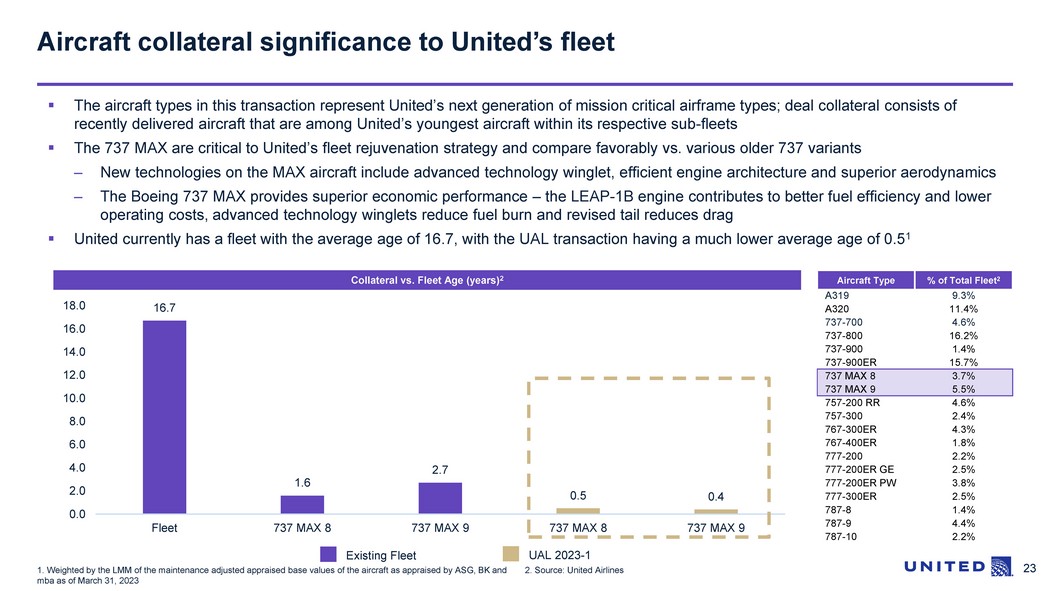 22 $- $200 $400 $600 $800 Aug-22 Sep-22 Oct-22 Nov-22 Dec-22 Feb-23 Mar-23 Apr-23 May-23 737 MAX 8 737 MAX 9 B y D e li v e r y D a te: 0.5 Y e a r s A v e r a g e A g e 1 Aircraft collateral – key observations Highlights NB / WB Value Distribution 1 Collateral Value by Aircraft Type 1 1. Weighted by the LMM of the maintenance adjusted appraised base values of the aircraft as appraised by ASG, BK and mba as of March 31, 2023 . LMM ($mm) Narrowbody (39), 100% 737 MAX 8 (22), 56% 737 MAX 9 (17), 44% ▪ The fleet types in this transaction represent United’s next generation mission critical airframe types ▪ The 100% concentration of narrowbody aircraft is the largest concentration of new/like - new narrowbody aircraft in any United EETC offering