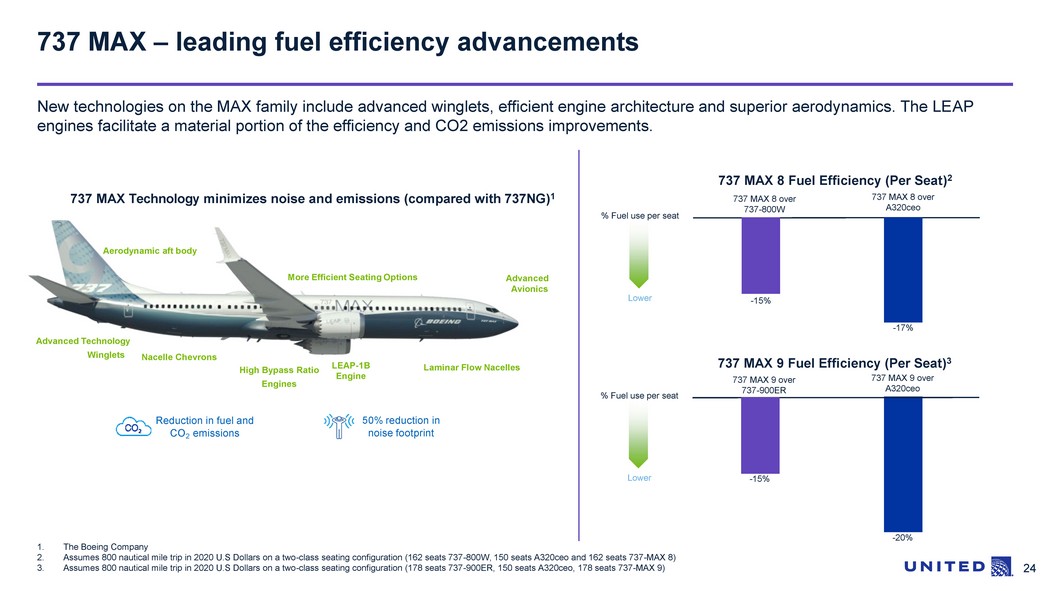 23 16.7 1.6 2.7 0.5 0.4 0.0 2.0 4.0 6.0 8.0 10.0 12.0 14.0 16.0 18.0 Fleet 737 MAX 8 737 MAX 9 737 MAX 8 737 MAX 9 Aircraft collateral significance to United’s fleet 1. Weighted by the LMM of the maintenance adjusted appraised base values of the aircraft as appraised by ASG, BK and mba as of March 31, 2023 2. Source: United Airlines ▪ The aircraft types in this transaction represent United’s next generation of mission critical airframe types; deal collateral co nsists of recently delivered aircraft that are among United’s youngest aircraft within its respective sub - fleets ▪ The 737 MAX are critical to United’s fleet rejuvenation strategy and compare favorably vs. various older 737 variants – New technologies on the MAX aircraft include advanced technology winglet, efficient engine architecture and superior aerodyna mic s – The Boeing 737 MAX provides superior economic performance – the LEAP - 1B engine contributes to better fuel efficiency and lower operating costs, advanced technology winglets reduce fuel burn and revised tail reduces drag ▪ United currently has a fleet with the average age of 16.7, with the UAL transaction having a much lower average age of 0.5 1 Collateral vs. Fleet Age (years) 2 Aircraft Type % of Total Fleet 2 A319 9.3% A320 11.4% 737 - 700 4.6% 737 - 800 16.2% 737 - 900 1.4% 737 - 900ER 15.7% 737 MAX 8 3.7% 737 MAX 9 5.5% 757 - 200 RR 4.6% 757 - 300 2.4% 767 - 300ER 4.3% 767 - 400ER 1.8% 777 - 200 2.2% 777 - 200ER GE 2.5% 777 - 200ER PW 3.8% 777 - 300ER 2.5% 787 - 8 1.4% 787 - 9 4.4% 787 - 10 2.2% Existing Fleet UAL 2023 - 1