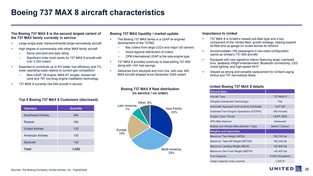 27 Sources: The Boeing Company; United Airlines, Inc.; FlightGlobal The Boeing 737 MAX 9 is the largest variant of the 737 MAX family currently in service ▪ Large single - aisle, transcontinental range narrowbody aircraft ▪ High degree of commonality with other MAX family aircraft – Same pilot pool and type rating – Significant order book exists for 737 MAX family with variants to be announced for 900+ cumulative orders ▪ Expected to contribute up to 8% better fuel efficiency and 7% lower operating costs relative to current - gen competition – New LEAP - 1B engine, MAX AT winglet, revised tail cone and 787 low - drag engine installation technology ▪ 737 MAX 9 currently has 88 firm orders Boeing 737 MAX 9 aircraft characteristics Boeing 737 MAX liquidity / market update ▪ The Boeing 737 MAX family is a LEAP re - engined development of the 737NG – Key orders from large LCCs and major US carriers – Good regional distribution of orders – CFM International LEAP is the sole engine type ▪ 737 MAX 9 provides continuity to 737 - 900ER along with 14% fuel savings ▪ Progressive reactivation of 737 MAX fleets in all but one key market (China) since grounding lifted in 2020 Boeing 737 MAX 9 fleet distribution (in service / on order) Importance to United ▪ Key component of the ‘United Next’ growth strategy, helping expand United’s fleet and up - gauge on routes across its network ▪ Accommodates 179 passengers in two - class configuration (same as United’s 737 - 900ER aircraft) ▪ Equipped with new signature interior featuring larger overhead bins, seatback inflight entertainment, Bluetooth connectivity, LED mood lighting, and high - speed Wi - Fi ▪ Viewed as a strong and versatile replacement for United’s aging Airbus and 757 narrowbody fleets Top 5 Boeing 737 MAX 9 Customers (disclosed) Operator Quantity United Airlines 97 Alaska Airlines 91 Copa Airlines 23 Aeromexico 18 Greater Bay Airlines 15 Total 244 United Boeing 737 MAX 9 details General Spec: Aircraft Type 73 7 MAX 9 Winglets (Advanced Technology ) Yes Automatic Approach and Landing Certificate CA T IIIA Extended Twin - Engine Operations (ETOPS) 180 minutes Engine Type / Thrust LEAP - 1B28 APU Manufacturer Honeywell Brakes and Wheels Manufacturer / Type Safran / Carbon Weights and Capacities: Maximum Taxi Weight (MTW) 195,200 lbs Maximum Take - Off Weight (MTOW) 194,700 lbs Maximum Landing Weight (MLW) 163,900 lbs Maximum Zero Fuel Weight (MZFW) 156,500 lbs Fuel Capacity 6,820 US gallons Cargo Capacity (max volume) 1,816 ft 3 North America , 60% Asia Pacific , 20% Latin America , 9% Middle East , 5% Other , 6%