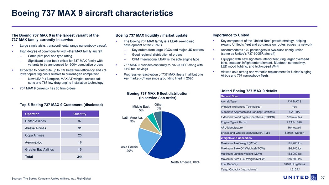 26 Sources: The Boeing Company; United Airlines, Inc.; FlightGlobal The Boeing 737 MAX 8 is the second largest variant of the 737 MAX family currently in service ▪ Large single - aisle, transcontinental range narrowbody aircraft ▪ High degree of commonality with other MAX family aircraft – Same pilot pool and type rating – Significant order book exists for 737 MAX 8 aircraft with over 2,200 orders ▪ Expected to contribute up to 8% better fuel efficiency and 7% lower operating costs relative to current - gen competition – New LEAP - 1B engine, MAX AT winglet, revised tail cone and 787 low - drag engine installation technology ▪ 737 MAX 8 currently has 649 aircraft in service Boeing 737 MAX 8 aircraft characteristics Top 5 Boeing 737 MAX 8 Customers (disclosed) Boeing 737 MAX liquidity / market update ▪ The Boeing 737 MAX family is a LEAP re - engined development of the 737NG – Key orders from large LCCs and major US carriers – Good regional distribution of orders – CFM International LEAP is the sole engine type ▪ 737 MAX 8 provides continuity to best - selling 737 - 800 along with 14% fuel savings ▪ Deliveries from stockpile and from line, with over 480 MAX aircraft shipped since December 2020 restart Boeing 737 MAX 8 fleet distribution (in service / on order) Importance to United ▪ 737 MAX 8 is United’s newest sub - fleet type and a key component of the ‘United Next’ growth strategy, helping expand its fleet and up - gauge on routes across its network ▪ Accommodates 166 passengers in two - class configuration (same as United’s 737 - 800 aircraft) ▪ Equipped with new signature interior featuring larger overhead bins, seatback inflight entertainment, Bluetooth connectivity, LED mood lighting, and high - speed Wi - Fi ▪ Viewed as strong and versatile replacement for United’s aging Airbus and 757 narrowbody fleets United Boeing 737 MAX 8 details Operator Quantity Southwest Airlines 464 Ryanair 164 United Airlines 132 American Airlines 130 SpiceJet 130 Total 1,020 General Spec: Aircraft Type 73 7 MAX 8 Winglets (Advanced Technology ) Yes Automatic Approach and Landing Certificate CA T IIIA Extended Twin - Engine Operations (ETOPS) 180 minutes Engine Type / Thrust LEAP - 1B28 APU Manufacturer Honeywell Brakes and Wheels Manufacturer / Type Safran / Carbon Weights and Capacities: Maximum Taxi Weight (MTW) 182,700 lbs Maximum Take - Off Weight (MTOW) 182,200 lbs Maximum Landing Weight (MLW) 152,800 lbs Maximum Zero Fuel Weight (MZFW) 145,400 lbs Fuel Capacity 6,820 US gallons Cargo Capacity (max volume) 1,540 ft 3 Asia Pacific , 33% North America , 33% Europe , 19% Latin America , 7% Other , 8%