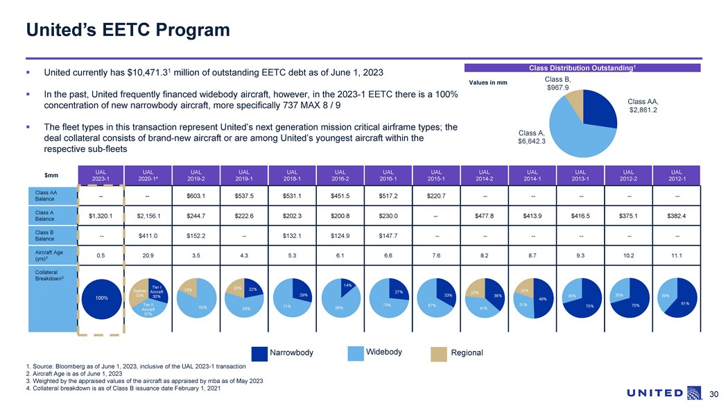 29 Position of Series 2023 - 1 collateral in United’s fleet 1 1. Number of aircraft in United’s operating fleet projected as of March 31, 2023. Source: United Airlines, Inc. 2. Includes one additional 737 MAX 9 and two additional 737 MAX 8 aircraft that are part of 2023 - 1 EETC collateral pool but were not yet delivered to United as of March 31, 2023 Existing Fleet UAL 2023 - 1 Aircraft Vintage Snapshot on March 31, 2023 1 Pre 2004 2004 2005 2006 2007 2008 2009 2010 2011 2012 2013 2014 2015 2016 2017 2018 2019 2020 2021 2022 2023 2 # in Fleet 787 - 10 13 8 21 787 - 9 25 3 10 38 787 - 8 12 12 777 - 300ER 22 22 777 - 200ER 51 2 2 55 777 - 200 19 19 767 - 400ER 16 16 767 - 300ER 38 38 757 - 300 21 21 757 - 200 40 40 737 MAX 9 30 8 10 2 7 57 737 MAX 8 16 1 15 8 7 47 737 - 900ER 136 136 737 - 900 12 12 737 - 800 105 12 13 11 141 737 - 700 40 40 A320 - 200 94 2 96 A319 - 100 81 81 ERJ - 175LL 45 45 ERJ - 175LR 30 24 54 ERJ - 145XR 100 100 CRJ - 550 23 8 31 1,122