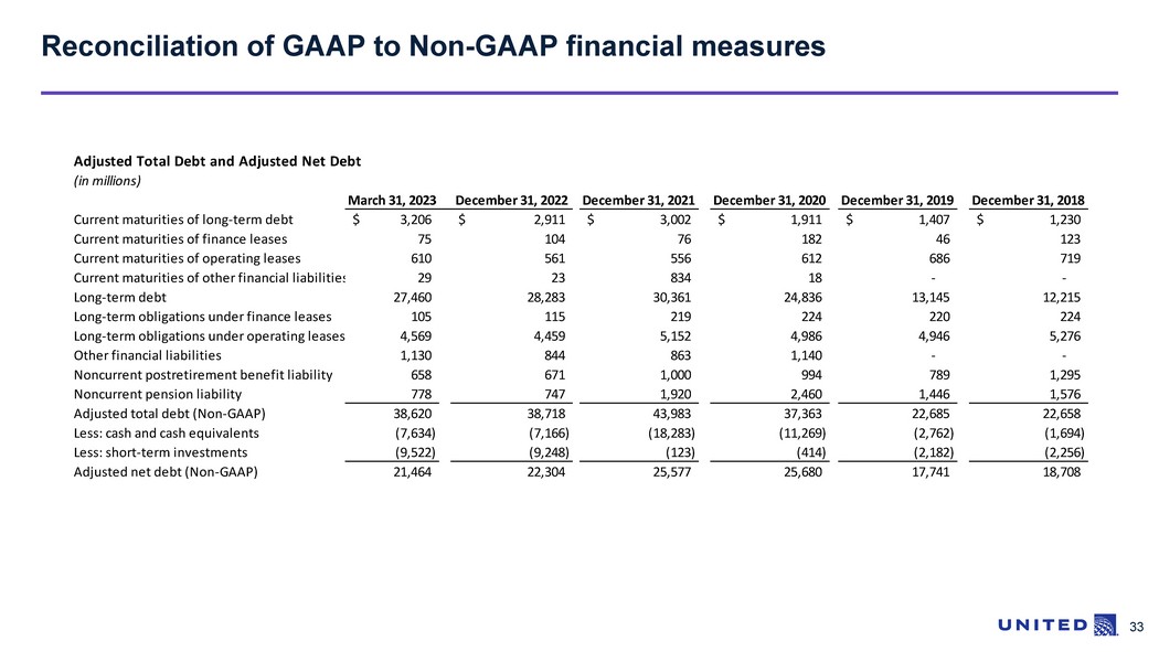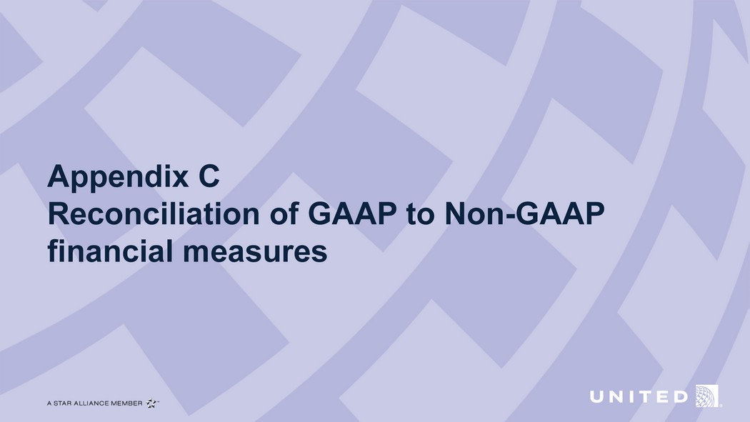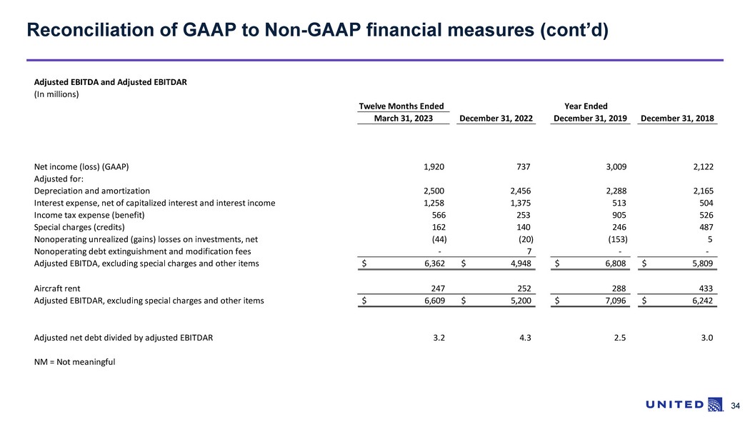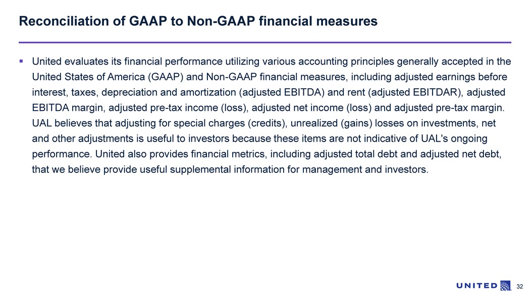 32 ▪ United evaluates its financial performance utilizing various accounting principles generally accepted in the United States of America (GAAP) and Non - GAAP financial measures, including adjusted earnings before interest, taxes, depreciation and amortization (adjusted EBITDA) and rent (adjusted EBITDAR), adjusted EBITDA margin, adjusted pre - tax income (loss), adjusted net income (loss) and adjusted pre - tax margin. UAL believes that adjusting for special charges (credits), unrealized (gains) losses on investments, net and other adjustments is useful to investors because these items are not indicative of UAL's ongoing performance. United also provides financial metrics, including adjusted total debt and adjusted net debt, that we believe provide useful supplemental information for management and investors. Reconciliation of GAAP to Non - GAAP financial measures