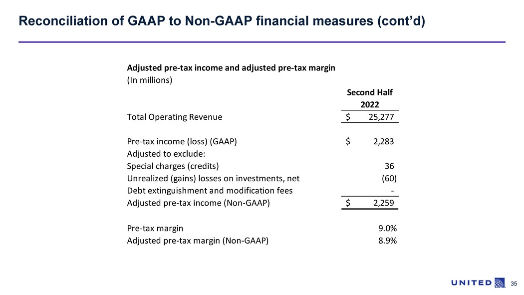 34 Reconciliation of GAAP to Non - GAAP financial measures (cont’d) Adjusted EBITDA and Adjusted EBITDAR (In millions) Twelve Months Ended March 31, 2023 December 31, 2022 December 31, 2019 December 31, 2018 Net income (loss) (GAAP) 1,920 737 3,009 2,122 Adjusted for: Depreciation and amortization 2,500 2,456 2,288 2,165 Interest expense, net of capitalized interest and interest income 1,258 1,375 513 504 Income tax expense (benefit) 566 253 905 526 Special charges (credits) 162 140 246 487 Nonoperating unrealized (gains) losses on investments, net (44) (20) (153) 5 Nonoperating debt extinguishment and modification fees - 7 - - Adjusted EBITDA, excluding special charges and other items 6,362$ 4,948$ 6,808$ 5,809$ Aircraft rent 247 252 288 433 Adjusted EBITDAR, excluding special charges and other items 6,609$ 5,200$ 7,096$ 6,242$ Adjusted net debt divided by adjusted EBITDAR 3.2 4.3 2.5 3.0 NM = Not meaningful Year Ended