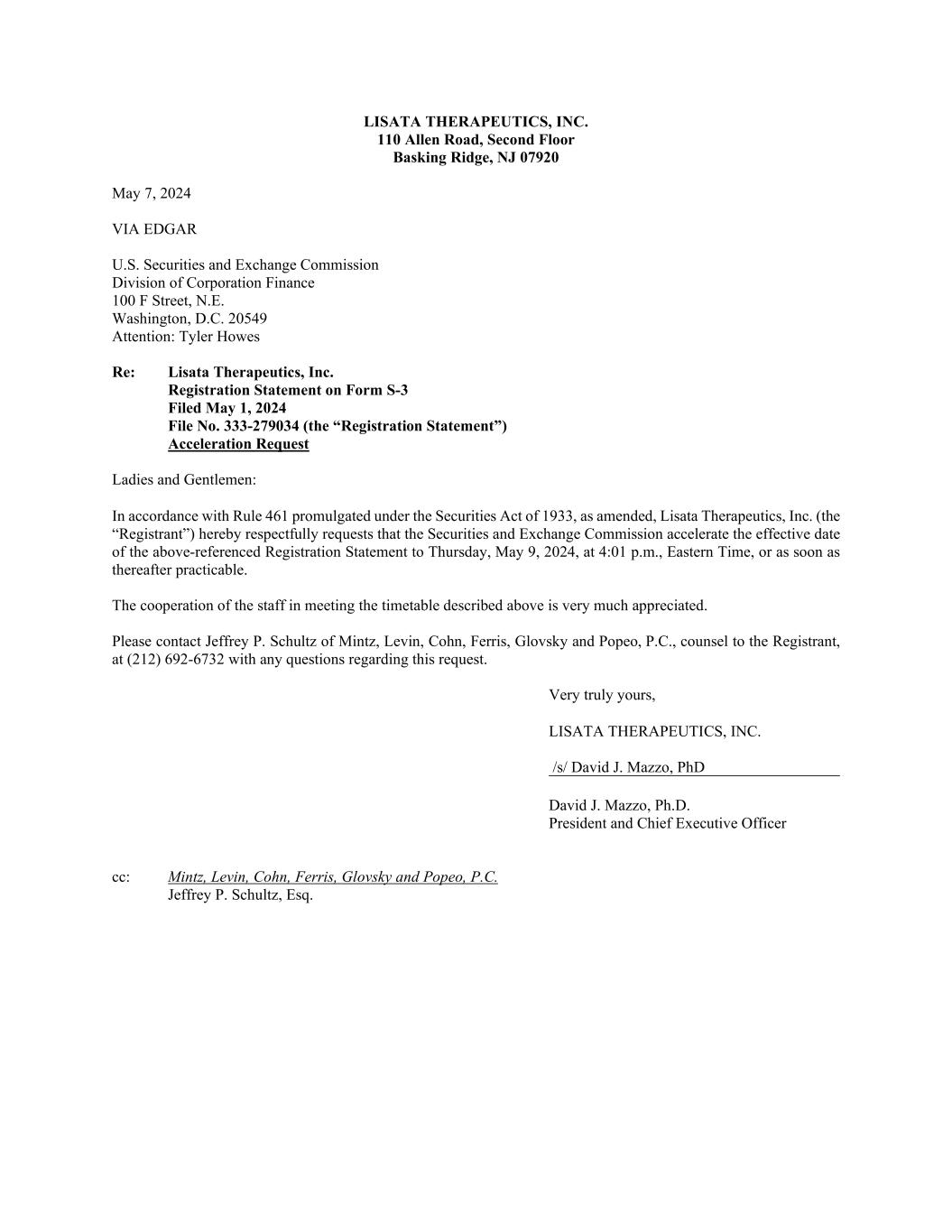 LISATA THERAPEUTICS, INC. 110 Allen Road, Second Floor Basking Ridge, NJ 07920 May 7, 2024 VIA EDGAR U.S. Securities and Exchange Commission Division of Corporation Finance 100 F Street, N.E. Washington, D.C. 20549 Attention: Tyler Howes Re: Lisata Therapeutics, Inc. Registration Statement on Form S-3 Filed May 1, 2024 File No. 333-279034 (the “Registration Statement”) Acceleration Request Ladies and Gentlemen: In accordance with Rule 461 promulgated under the Securities Act of 1933, as amended, Lisata Therapeutics, Inc. (the “Registrant”) hereby respectfully requests that the Securities and Exchange Commission accelerate the effective date of the above-referenced Registration Statement to Thursday, May 9, 2024, at 4:01 p.m., Eastern Time, or as soon as thereafter practicable. The cooperation of the staff in meeting the timetable described above is very much appreciated. Please contact Jeffrey P. Schultz of Mintz, Levin, Cohn, Ferris, Glovsky and Popeo, P.C., counsel to the Registrant, at (212) 692-6732 with any questions regarding this request. Very truly yours, LISATA THERAPEUTICS, INC. /s/ David J. Mazzo, PhD David J. Mazzo, Ph.D. President and Chief Executive Officer cc: Mintz, Levin, Cohn, Ferris, Glovsky and Popeo, P.C. Jeffrey P. Schultz, Esq.