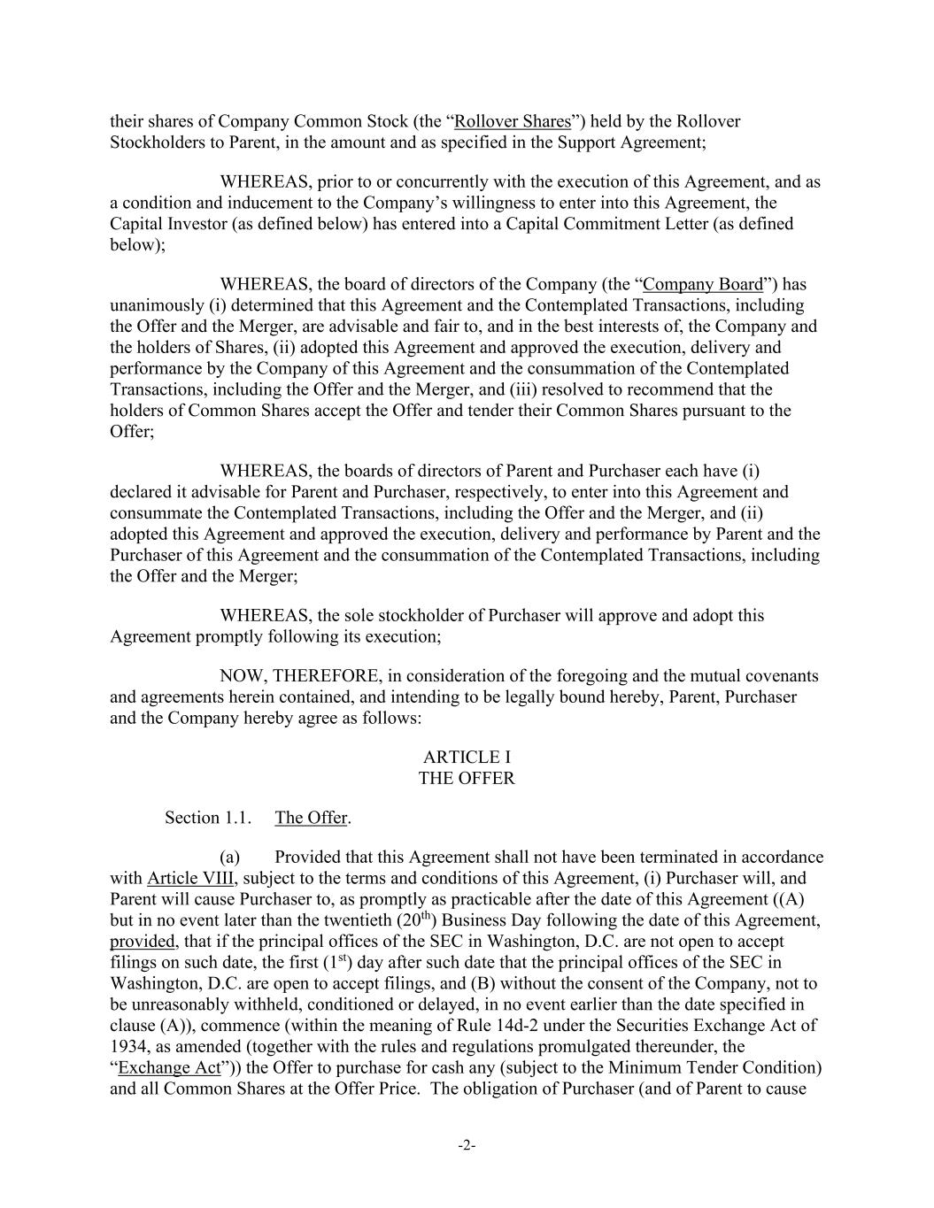 -2- their shares of Company Common Stock (the “Rollover Shares”) held by the Rollover Stockholders to Parent, in the amount and as specified in the Support Agreement; WHEREAS, prior to or concurrently with the execution of this Agreement, and as a condition and inducement to the Company’s willingness to enter into this Agreement, the Capital Investor (as defined below) has entered into a Capital Commitment Letter (as defined below); WHEREAS, the board of directors of the Company (the “Company Board”) has unanimously (i) determined that this Agreement and the Contemplated Transactions, including the Offer and the Merger, are advisable and fair to, and in the best interests of, the Company and the holders of Shares, (ii) adopted this Agreement and approved the execution, delivery and performance by the Company of this Agreement and the consummation of the Contemplated Transactions, including the Offer and the Merger, and (iii) resolved to recommend that the holders of Common Shares accept the Offer and tender their Common Shares pursuant to the Offer; WHEREAS, the boards of directors of Parent and Purchaser each have (i) declared it advisable for Parent and Purchaser, respectively, to enter into this Agreement and consummate the Contemplated Transactions, including the Offer and the Merger, and (ii) adopted this Agreement and approved the execution, delivery and performance by Parent and the Purchaser of this Agreement and the consummation of the Contemplated Transactions, including the Offer and the Merger; WHEREAS, the sole stockholder of Purchaser will approve and adopt this Agreement promptly following its execution; NOW, THEREFORE, in consideration of the foregoing and the mutual covenants and agreements herein contained, and intending to be legally bound hereby, Parent, Purchaser and the Company hereby agree as follows: ARTICLE I THE OFFER Section 1.1. The Offer. (a) Provided that this Agreement shall not have been terminated in accordance with Article VIII, subject to the terms and conditions of this Agreement, (i) Purchaser will, and Parent will cause Purchaser to, as promptly as practicable after the date of this Agreement ((A) but in no event later than the twentieth (20th) Business Day following the date of this Agreement, provided, that if the principal offices of the SEC in Washington, D.C. are not open to accept filings on such date, the first (1st) day after such date that the principal offices of the SEC in Washington, D.C. are open to accept filings, and (B) without the consent of the Company, not to be unreasonably withheld, conditioned or delayed, in no event earlier than the date specified in clause (A)), commence (within the meaning of Rule 14d-2 under the Securities Exchange Act of 1934, as amended (together with the rules and regulations promulgated thereunder, the “Exchange Act”)) the Offer to purchase for cash any (subject to the Minimum Tender Condition) and all Common Shares at the Offer Price. The obligation of Purchaser (and of Parent to cause