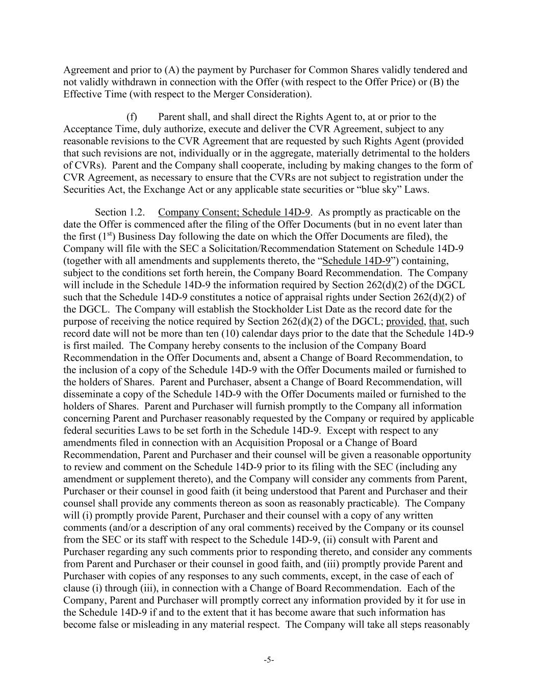 -5- Agreement and prior to (A) the payment by Purchaser for Common Shares validly tendered and not validly withdrawn in connection with the Offer (with respect to the Offer Price) or (B) the Effective Time (with respect to the Merger Consideration). (f) Parent shall, and shall direct the Rights Agent to, at or prior to the Acceptance Time, duly authorize, execute and deliver the CVR Agreement, subject to any reasonable revisions to the CVR Agreement that are requested by such Rights Agent (provided that such revisions are not, individually or in the aggregate, materially detrimental to the holders of CVRs). Parent and the Company shall cooperate, including by making changes to the form of CVR Agreement, as necessary to ensure that the CVRs are not subject to registration under the Securities Act, the Exchange Act or any applicable state securities or “blue sky” Laws. Section 1.2. Company Consent; Schedule 14D-9. As promptly as practicable on the date the Offer is commenced after the filing of the Offer Documents (but in no event later than the first (1st) Business Day following the date on which the Offer Documents are filed), the Company will file with the SEC a Solicitation/Recommendation Statement on Schedule 14D-9 (together with all amendments and supplements thereto, the “Schedule 14D-9”) containing, subject to the conditions set forth herein, the Company Board Recommendation. The Company will include in the Schedule 14D-9 the information required by Section 262(d)(2) of the DGCL such that the Schedule 14D-9 constitutes a notice of appraisal rights under Section 262(d)(2) of the DGCL. The Company will establish the Stockholder List Date as the record date for the purpose of receiving the notice required by Section 262(d)(2) of the DGCL; provided, that, such record date will not be more than ten (10) calendar days prior to the date that the Schedule 14D-9 is first mailed. The Company hereby consents to the inclusion of the Company Board Recommendation in the Offer Documents and, absent a Change of Board Recommendation, to the inclusion of a copy of the Schedule 14D-9 with the Offer Documents mailed or furnished to the holders of Shares. Parent and Purchaser, absent a Change of Board Recommendation, will disseminate a copy of the Schedule 14D-9 with the Offer Documents mailed or furnished to the holders of Shares. Parent and Purchaser will furnish promptly to the Company all information concerning Parent and Purchaser reasonably requested by the Company or required by applicable federal securities Laws to be set forth in the Schedule 14D-9. Except with respect to any amendments filed in connection with an Acquisition Proposal or a Change of Board Recommendation, Parent and Purchaser and their counsel will be given a reasonable opportunity to review and comment on the Schedule 14D-9 prior to its filing with the SEC (including any amendment or supplement thereto), and the Company will consider any comments from Parent, Purchaser or their counsel in good faith (it being understood that Parent and Purchaser and their counsel shall provide any comments thereon as soon as reasonably practicable). The Company will (i) promptly provide Parent, Purchaser and their counsel with a copy of any written comments (and/or a description of any oral comments) received by the Company or its counsel from the SEC or its staff with respect to the Schedule 14D-9, (ii) consult with Parent and Purchaser regarding any such comments prior to responding thereto, and consider any comments from Parent and Purchaser or their counsel in good faith, and (iii) promptly provide Parent and Purchaser with copies of any responses to any such comments, except, in the case of each of clause (i) through (iii), in connection with a Change of Board Recommendation. Each of the Company, Parent and Purchaser will promptly correct any information provided by it for use in the Schedule 14D-9 if and to the extent that it has become aware that such information has become false or misleading in any material respect. The Company will take all steps reasonably