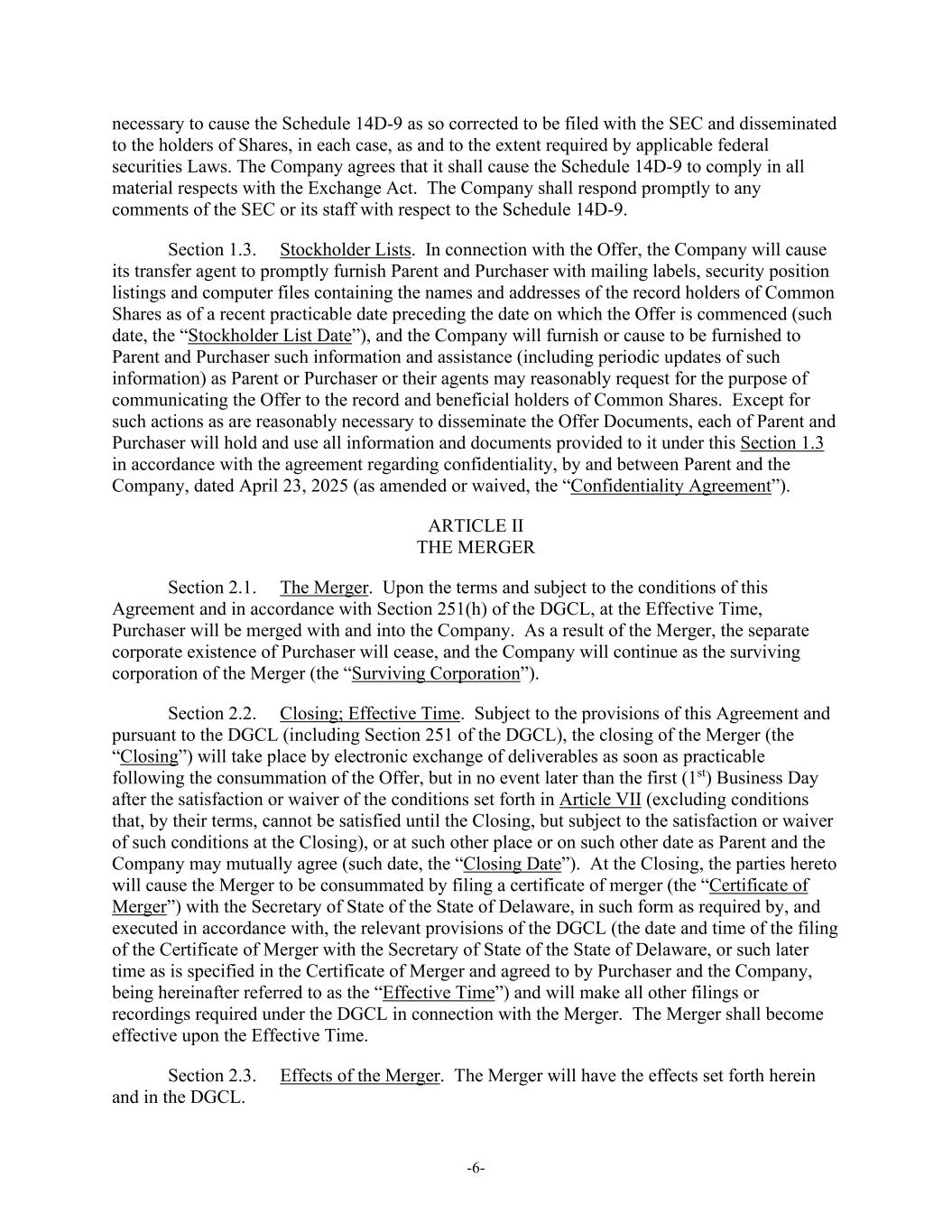 -6- necessary to cause the Schedule 14D-9 as so corrected to be filed with the SEC and disseminated to the holders of Shares, in each case, as and to the extent required by applicable federal securities Laws. The Company agrees that it shall cause the Schedule 14D-9 to comply in all material respects with the Exchange Act. The Company shall respond promptly to any comments of the SEC or its staff with respect to the Schedule 14D-9. Section 1.3. Stockholder Lists. In connection with the Offer, the Company will cause its transfer agent to promptly furnish Parent and Purchaser with mailing labels, security position listings and computer files containing the names and addresses of the record holders of Common Shares as of a recent practicable date preceding the date on which the Offer is commenced (such date, the “Stockholder List Date”), and the Company will furnish or cause to be furnished to Parent and Purchaser such information and assistance (including periodic updates of such information) as Parent or Purchaser or their agents may reasonably request for the purpose of communicating the Offer to the record and beneficial holders of Common Shares. Except for such actions as are reasonably necessary to disseminate the Offer Documents, each of Parent and Purchaser will hold and use all information and documents provided to it under this Section 1.3 in accordance with the agreement regarding confidentiality, by and between Parent and the Company, dated April 23, 2025 (as amended or waived, the “Confidentiality Agreement”). ARTICLE II THE MERGER Section 2.1. The Merger. Upon the terms and subject to the conditions of this Agreement and in accordance with Section 251(h) of the DGCL, at the Effective Time, Purchaser will be merged with and into the Company. As a result of the Merger, the separate corporate existence of Purchaser will cease, and the Company will continue as the surviving corporation of the Merger (the “Surviving Corporation”). Section 2.2. Closing; Effective Time. Subject to the provisions of this Agreement and pursuant to the DGCL (including Section 251 of the DGCL), the closing of the Merger (the “Closing”) will take place by electronic exchange of deliverables as soon as practicable following the consummation of the Offer, but in no event later than the first (1st) Business Day after the satisfaction or waiver of the conditions set forth in Article VII (excluding conditions that, by their terms, cannot be satisfied until the Closing, but subject to the satisfaction or waiver of such conditions at the Closing), or at such other place or on such other date as Parent and the Company may mutually agree (such date, the “Closing Date”). At the Closing, the parties hereto will cause the Merger to be consummated by filing a certificate of merger (the “Certificate of Merger”) with the Secretary of State of the State of Delaware, in such form as required by, and executed in accordance with, the relevant provisions of the DGCL (the date and time of the filing of the Certificate of Merger with the Secretary of State of the State of Delaware, or such later time as is specified in the Certificate of Merger and agreed to by Purchaser and the Company, being hereinafter referred to as the “Effective Time”) and will make all other filings or recordings required under the DGCL in connection with the Merger. The Merger shall become effective upon the Effective Time. Section 2.3. Effects of the Merger. The Merger will have the effects set forth herein and in the DGCL.