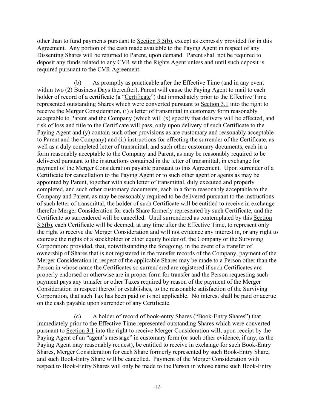 -12- other than to fund payments pursuant to Section 3.5(b), except as expressly provided for in this Agreement. Any portion of the cash made available to the Paying Agent in respect of any Dissenting Shares will be returned to Parent, upon demand. Parent shall not be required to deposit any funds related to any CVR with the Rights Agent unless and until such deposit is required pursuant to the CVR Agreement. (b) As promptly as practicable after the Effective Time (and in any event within two (2) Business Days thereafter), Parent will cause the Paying Agent to mail to each holder of record of a certificate (a “Certificate”) that immediately prior to the Effective Time represented outstanding Shares which were converted pursuant to Section 3.1 into the right to receive the Merger Consideration, (i) a letter of transmittal in customary form reasonably acceptable to Parent and the Company (which will (x) specify that delivery will be effected, and risk of loss and title to the Certificate will pass, only upon delivery of such Certificate to the Paying Agent and (y) contain such other provisions as are customary and reasonably acceptable to Parent and the Company) and (ii) instructions for effecting the surrender of the Certificate, as well as a duly completed letter of transmittal, and such other customary documents, each in a form reasonably acceptable to the Company and Parent, as may be reasonably required to be delivered pursuant to the instructions contained in the letter of transmittal, in exchange for payment of the Merger Consideration payable pursuant to this Agreement. Upon surrender of a Certificate for cancellation to the Paying Agent or to such other agent or agents as may be appointed by Parent, together with such letter of transmittal, duly executed and properly completed, and such other customary documents, each in a form reasonably acceptable to the Company and Parent, as may be reasonably required to be delivered pursuant to the instructions of such letter of transmittal, the holder of such Certificate will be entitled to receive in exchange therefor Merger Consideration for each Share formerly represented by such Certificate, and the Certificate so surrendered will be cancelled. Until surrendered as contemplated by this Section 3.5(b), each Certificate will be deemed, at any time after the Effective Time, to represent only the right to receive the Merger Consideration and will not evidence any interest in, or any right to exercise the rights of a stockholder or other equity holder of, the Company or the Surviving Corporation; provided, that, notwithstanding the foregoing, in the event of a transfer of ownership of Shares that is not registered in the transfer records of the Company, payment of the Merger Consideration in respect of the applicable Shares may be made to a Person other than the Person in whose name the Certificates so surrendered are registered if such Certificates are properly endorsed or otherwise are in proper form for transfer and the Person requesting such payment pays any transfer or other Taxes required by reason of the payment of the Merger Consideration in respect thereof or establishes, to the reasonable satisfaction of the Surviving Corporation, that such Tax has been paid or is not applicable. No interest shall be paid or accrue on the cash payable upon surrender of any Certificate. (c) A holder of record of book-entry Shares (“Book-Entry Shares”) that immediately prior to the Effective Time represented outstanding Shares which were converted pursuant to Section 3.1 into the right to receive Merger Consideration will, upon receipt by the Paying Agent of an “agent’s message” in customary form (or such other evidence, if any, as the Paying Agent may reasonably request), be entitled to receive in exchange for such Book-Entry Shares, Merger Consideration for each Share formerly represented by such Book-Entry Share, and such Book-Entry Share will be cancelled. Payment of the Merger Consideration with respect to Book-Entry Shares will only be made to the Person in whose name such Book-Entry