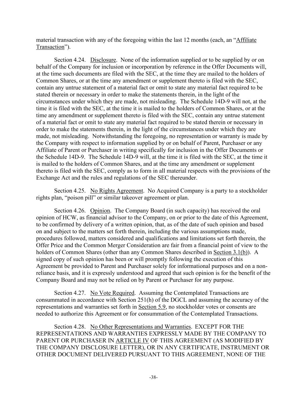-38- material transaction with any of the foregoing within the last 12 months (each, an “Affiliate Transaction”). Section 4.24. Disclosure. None of the information supplied or to be supplied by or on behalf of the Company for inclusion or incorporation by reference in the Offer Documents will, at the time such documents are filed with the SEC, at the time they are mailed to the holders of Common Shares, or at the time any amendment or supplement thereto is filed with the SEC, contain any untrue statement of a material fact or omit to state any material fact required to be stated therein or necessary in order to make the statements therein, in the light of the circumstances under which they are made, not misleading. The Schedule 14D-9 will not, at the time it is filed with the SEC, at the time it is mailed to the holders of Common Shares, or at the time any amendment or supplement thereto is filed with the SEC, contain any untrue statement of a material fact or omit to state any material fact required to be stated therein or necessary in order to make the statements therein, in the light of the circumstances under which they are made, not misleading. Notwithstanding the foregoing, no representation or warranty is made by the Company with respect to information supplied by or on behalf of Parent, Purchaser or any Affiliate of Parent or Purchaser in writing specifically for inclusion in the Offer Documents or the Schedule 14D-9. The Schedule 14D-9 will, at the time it is filed with the SEC, at the time it is mailed to the holders of Common Shares, and at the time any amendment or supplement thereto is filed with the SEC, comply as to form in all material respects with the provisions of the Exchange Act and the rules and regulations of the SEC thereunder. Section 4.25. No Rights Agreement. No Acquired Company is a party to a stockholder rights plan, “poison pill” or similar takeover agreement or plan. Section 4.26. Opinion. The Company Board (in such capacity) has received the oral opinion of HCW, as financial advisor to the Company, on or prior to the date of this Agreement, to be confirmed by delivery of a written opinion, that, as of the date of such opinion and based on and subject to the matters set forth therein, including the various assumptions made, procedures followed, matters considered and qualifications and limitations set forth therein, the Offer Price and the Common Merger Consideration are fair from a financial point of view to the holders of Common Shares (other than any Common Shares described in Section 3.1(b)). A signed copy of such opinion has been or will promptly following the execution of this Agreement be provided to Parent and Purchaser solely for informational purposes and on a non- reliance basis, and it is expressly understood and agreed that such opinion is for the benefit of the Company Board and may not be relied on by Parent or Purchaser for any purpose. Section 4.27. No Vote Required. Assuming the Contemplated Transactions are consummated in accordance with Section 251(h) of the DGCL and assuming the accuracy of the representations and warranties set forth in Section 5.9, no stockholder votes or consents are needed to authorize this Agreement or for consummation of the Contemplated Transactions. Section 4.28. No Other Representations and Warranties. EXCEPT FOR THE REPRESENTATIONS AND WARRANTIES EXPRESSLY MADE BY THE COMPANY TO PARENT OR PURCHASER IN ARTICLE IV OF THIS AGREEMENT (AS MODIFIED BY THE COMPANY DISCLOSURE LETTER), OR IN ANY CERTIFICATE, INSTRUMENT OR OTHER DOCUMENT DELIVERED PURSUANT TO THIS AGREEMENT, NONE OF THE