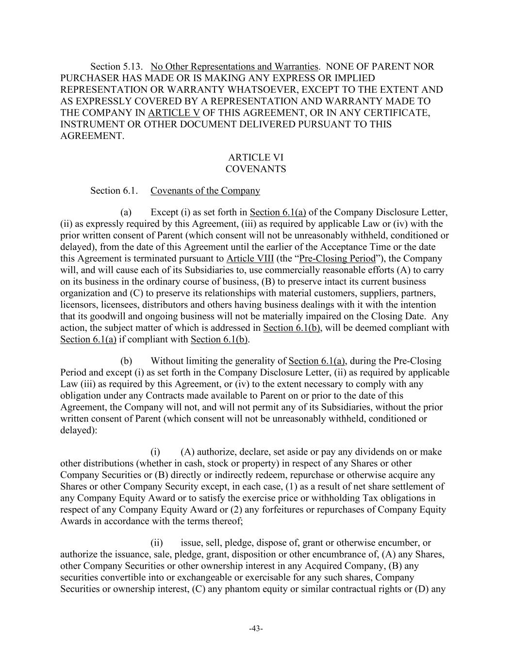 -43- Section 5.13. No Other Representations and Warranties. NONE OF PARENT NOR PURCHASER HAS MADE OR IS MAKING ANY EXPRESS OR IMPLIED REPRESENTATION OR WARRANTY WHATSOEVER, EXCEPT TO THE EXTENT AND AS EXPRESSLY COVERED BY A REPRESENTATION AND WARRANTY MADE TO THE COMPANY IN ARTICLE V OF THIS AGREEMENT, OR IN ANY CERTIFICATE, INSTRUMENT OR OTHER DOCUMENT DELIVERED PURSUANT TO THIS AGREEMENT. ARTICLE VI COVENANTS Section 6.1. Covenants of the Company (a) Except (i) as set forth in Section 6.1(a) of the Company Disclosure Letter, (ii) as expressly required by this Agreement, (iii) as required by applicable Law or (iv) with the prior written consent of Parent (which consent will not be unreasonably withheld, conditioned or delayed), from the date of this Agreement until the earlier of the Acceptance Time or the date this Agreement is terminated pursuant to Article VIII (the “Pre-Closing Period”), the Company will, and will cause each of its Subsidiaries to, use commercially reasonable efforts (A) to carry on its business in the ordinary course of business, (B) to preserve intact its current business organization and (C) to preserve its relationships with material customers, suppliers, partners, licensors, licensees, distributors and others having business dealings with it with the intention that its goodwill and ongoing business will not be materially impaired on the Closing Date. Any action, the subject matter of which is addressed in Section 6.1(b), will be deemed compliant with Section 6.1(a) if compliant with Section 6.1(b). (b) Without limiting the generality of Section 6.1(a), during the Pre-Closing Period and except (i) as set forth in the Company Disclosure Letter, (ii) as required by applicable Law (iii) as required by this Agreement, or (iv) to the extent necessary to comply with any obligation under any Contracts made available to Parent on or prior to the date of this Agreement, the Company will not, and will not permit any of its Subsidiaries, without the prior written consent of Parent (which consent will not be unreasonably withheld, conditioned or delayed): (i) (A) authorize, declare, set aside or pay any dividends on or make other distributions (whether in cash, stock or property) in respect of any Shares or other Company Securities or (B) directly or indirectly redeem, repurchase or otherwise acquire any Shares or other Company Security except, in each case, (1) as a result of net share settlement of any Company Equity Award or to satisfy the exercise price or withholding Tax obligations in respect of any Company Equity Award or (2) any forfeitures or repurchases of Company Equity Awards in accordance with the terms thereof; (ii) issue, sell, pledge, dispose of, grant or otherwise encumber, or authorize the issuance, sale, pledge, grant, disposition or other encumbrance of, (A) any Shares, other Company Securities or other ownership interest in any Acquired Company, (B) any securities convertible into or exchangeable or exercisable for any such shares, Company Securities or ownership interest, (C) any phantom equity or similar contractual rights or (D) any
