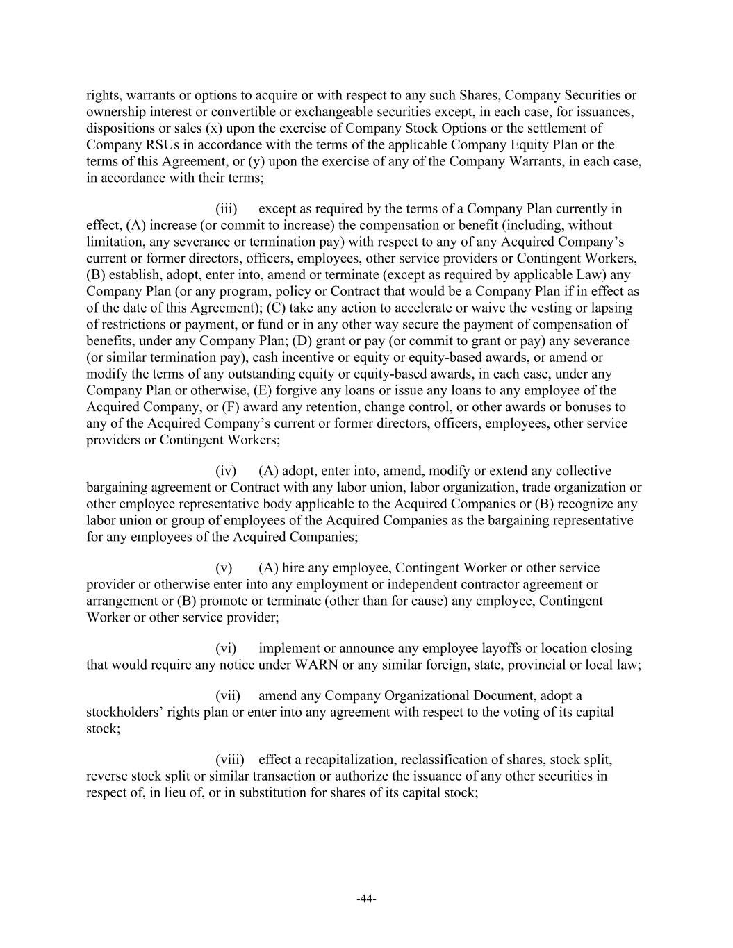 -44- rights, warrants or options to acquire or with respect to any such Shares, Company Securities or ownership interest or convertible or exchangeable securities except, in each case, for issuances, dispositions or sales (x) upon the exercise of Company Stock Options or the settlement of Company RSUs in accordance with the terms of the applicable Company Equity Plan or the terms of this Agreement, or (y) upon the exercise of any of the Company Warrants, in each case, in accordance with their terms; (iii) except as required by the terms of a Company Plan currently in effect, (A) increase (or commit to increase) the compensation or benefit (including, without limitation, any severance or termination pay) with respect to any of any Acquired Company’s current or former directors, officers, employees, other service providers or Contingent Workers, (B) establish, adopt, enter into, amend or terminate (except as required by applicable Law) any Company Plan (or any program, policy or Contract that would be a Company Plan if in effect as of the date of this Agreement); (C) take any action to accelerate or waive the vesting or lapsing of restrictions or payment, or fund or in any other way secure the payment of compensation of benefits, under any Company Plan; (D) grant or pay (or commit to grant or pay) any severance (or similar termination pay), cash incentive or equity or equity-based awards, or amend or modify the terms of any outstanding equity or equity-based awards, in each case, under any Company Plan or otherwise, (E) forgive any loans or issue any loans to any employee of the Acquired Company, or (F) award any retention, change control, or other awards or bonuses to any of the Acquired Company’s current or former directors, officers, employees, other service providers or Contingent Workers; (iv) (A) adopt, enter into, amend, modify or extend any collective bargaining agreement or Contract with any labor union, labor organization, trade organization or other employee representative body applicable to the Acquired Companies or (B) recognize any labor union or group of employees of the Acquired Companies as the bargaining representative for any employees of the Acquired Companies; (v) (A) hire any employee, Contingent Worker or other service provider or otherwise enter into any employment or independent contractor agreement or arrangement or (B) promote or terminate (other than for cause) any employee, Contingent Worker or other service provider; (vi) implement or announce any employee layoffs or location closing that would require any notice under WARN or any similar foreign, state, provincial or local law; (vii) amend any Company Organizational Document, adopt a stockholders’ rights plan or enter into any agreement with respect to the voting of its capital stock; (viii) effect a recapitalization, reclassification of shares, stock split, reverse stock split or similar transaction or authorize the issuance of any other securities in respect of, in lieu of, or in substitution for shares of its capital stock;