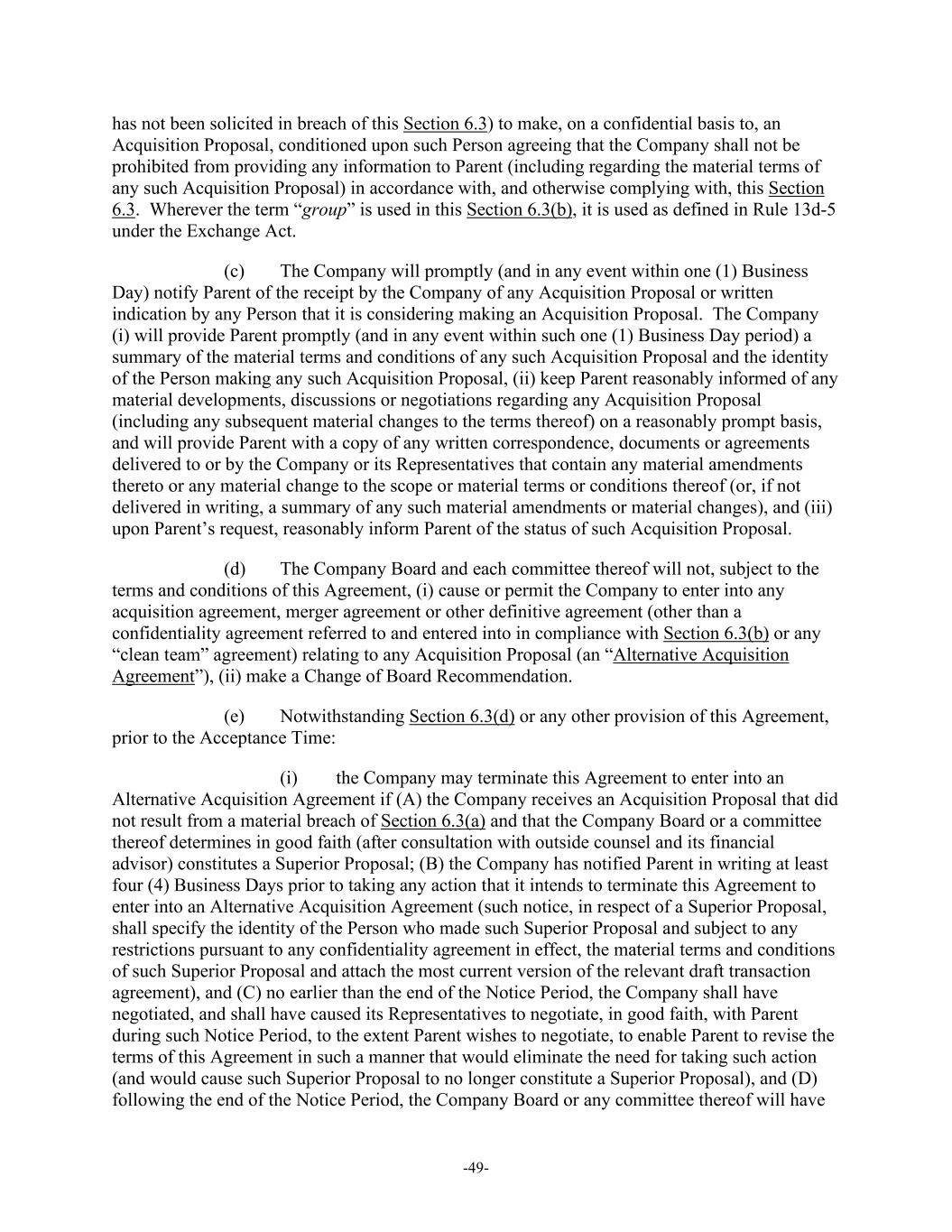 -49- has not been solicited in breach of this Section 6.3) to make, on a confidential basis to, an Acquisition Proposal, conditioned upon such Person agreeing that the Company shall not be prohibited from providing any information to Parent (including regarding the material terms of any such Acquisition Proposal) in accordance with, and otherwise complying with, this Section 6.3. Wherever the term “group” is used in this Section 6.3(b), it is used as defined in Rule 13d-5 under the Exchange Act. (c) The Company will promptly (and in any event within one (1) Business Day) notify Parent of the receipt by the Company of any Acquisition Proposal or written indication by any Person that it is considering making an Acquisition Proposal. The Company (i) will provide Parent promptly (and in any event within such one (1) Business Day period) a summary of the material terms and conditions of any such Acquisition Proposal and the identity of the Person making any such Acquisition Proposal, (ii) keep Parent reasonably informed of any material developments, discussions or negotiations regarding any Acquisition Proposal (including any subsequent material changes to the terms thereof) on a reasonably prompt basis, and will provide Parent with a copy of any written correspondence, documents or agreements delivered to or by the Company or its Representatives that contain any material amendments thereto or any material change to the scope or material terms or conditions thereof (or, if not delivered in writing, a summary of any such material amendments or material changes), and (iii) upon Parent’s request, reasonably inform Parent of the status of such Acquisition Proposal. (d) The Company Board and each committee thereof will not, subject to the terms and conditions of this Agreement, (i) cause or permit the Company to enter into any acquisition agreement, merger agreement or other definitive agreement (other than a confidentiality agreement referred to and entered into in compliance with Section 6.3(b) or any “clean team” agreement) relating to any Acquisition Proposal (an “Alternative Acquisition Agreement”), (ii) make a Change of Board Recommendation. (e) Notwithstanding Section 6.3(d) or any other provision of this Agreement, prior to the Acceptance Time: (i) the Company may terminate this Agreement to enter into an Alternative Acquisition Agreement if (A) the Company receives an Acquisition Proposal that did not result from a material breach of Section 6.3(a) and that the Company Board or a committee thereof determines in good faith (after consultation with outside counsel and its financial advisor) constitutes a Superior Proposal; (B) the Company has notified Parent in writing at least four (4) Business Days prior to taking any action that it intends to terminate this Agreement to enter into an Alternative Acquisition Agreement (such notice, in respect of a Superior Proposal, shall specify the identity of the Person who made such Superior Proposal and subject to any restrictions pursuant to any confidentiality agreement in effect, the material terms and conditions of such Superior Proposal and attach the most current version of the relevant draft transaction agreement), and (C) no earlier than the end of the Notice Period, the Company shall have negotiated, and shall have caused its Representatives to negotiate, in good faith, with Parent during such Notice Period, to the extent Parent wishes to negotiate, to enable Parent to revise the terms of this Agreement in such a manner that would eliminate the need for taking such action (and would cause such Superior Proposal to no longer constitute a Superior Proposal), and (D) following the end of the Notice Period, the Company Board or any committee thereof will have