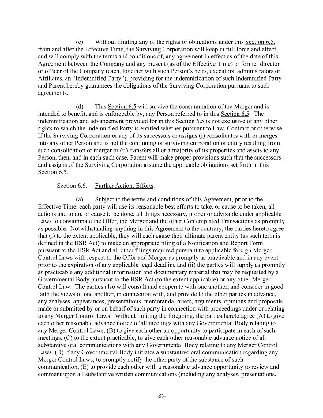 -53- (c) Without limiting any of the rights or obligations under this Section 6.5, from and after the Effective Time, the Surviving Corporation will keep in full force and effect, and will comply with the terms and conditions of, any agreement in effect as of the date of this Agreement between the Company and any present (as of the Effective Time) or former director or officer of the Company (each, together with such Person’s heirs, executors, administrators or Affiliates, an “Indemnified Party”), providing for the indemnification of such Indemnified Party and Parent hereby guarantees the obligations of the Surviving Corporation pursuant to such agreements. (d) This Section 6.5 will survive the consummation of the Merger and is intended to benefit, and is enforceable by, any Person referred to in this Section 6.5. The indemnification and advancement provided for in this Section 6.5 is not exclusive of any other rights to which the Indemnified Party is entitled whether pursuant to Law, Contract or otherwise. If the Surviving Corporation or any of its successors or assigns (i) consolidates with or merges into any other Person and is not the continuing or surviving corporation or entity resulting from such consolidation or merger or (ii) transfers all or a majority of its properties and assets to any Person, then, and in each such case, Parent will make proper provisions such that the successors and assigns of the Surviving Corporation assume the applicable obligations set forth in this Section 6.5. Section 6.6. Further Action; Efforts. (a) Subject to the terms and conditions of this Agreement, prior to the Effective Time, each party will use its reasonable best efforts to take, or cause to be taken, all actions and to do, or cause to be done, all things necessary, proper or advisable under applicable Laws to consummate the Offer, the Merger and the other Contemplated Transactions as promptly as possible. Notwithstanding anything in this Agreement to the contrary, the parties hereto agree that (i) to the extent applicable, they will each cause their ultimate parent entity (as such term is defined in the HSR Act) to make an appropriate filing of a Notification and Report Form pursuant to the HSR Act and all other filings required pursuant to applicable foreign Merger Control Laws with respect to the Offer and Merger as promptly as practicable and in any event prior to the expiration of any applicable legal deadline and (ii) the parties will supply as promptly as practicable any additional information and documentary material that may be requested by a Governmental Body pursuant to the HSR Act (to the extent applicable) or any other Merger Control Law. The parties also will consult and cooperate with one another, and consider in good faith the views of one another, in connection with, and provide to the other parties in advance, any analyses, appearances, presentations, memoranda, briefs, arguments, opinions and proposals made or submitted by or on behalf of such party in connection with proceedings under or relating to any Merger Control Laws. Without limiting the foregoing, the parties hereto agree (A) to give each other reasonable advance notice of all meetings with any Governmental Body relating to any Merger Control Laws, (B) to give each other an opportunity to participate in each of such meetings, (C) to the extent practicable, to give each other reasonable advance notice of all substantive oral communications with any Governmental Body relating to any Merger Control Laws, (D) if any Governmental Body initiates a substantive oral communication regarding any Merger Control Laws, to promptly notify the other party of the substance of such communication, (E) to provide each other with a reasonable advance opportunity to review and comment upon all substantive written communications (including any analyses, presentations,